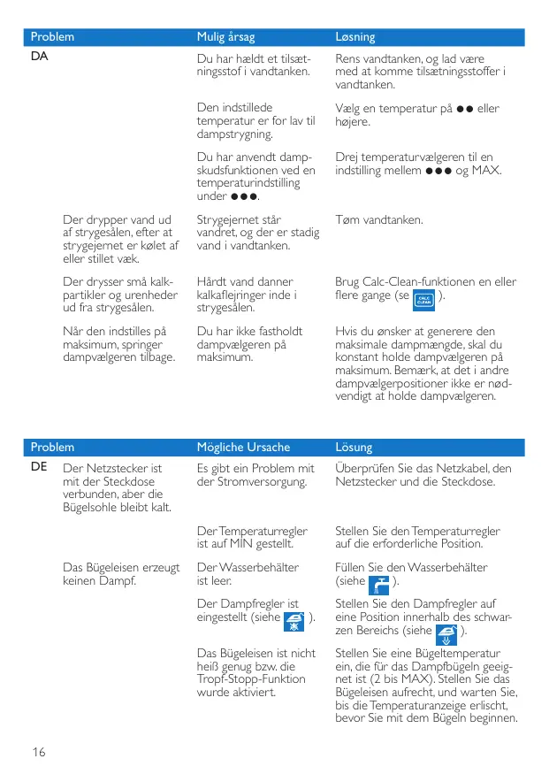 Sie haben die Dampfstoß-Funktion zu oft innerhalb zu kurzer Zeit aktiviert. Bügeln Sie eine Zeit lang mit waagerecht gehaltenem Bügeleisen weiter, bevor Sie die DampfstoßFunktion erneut betätigen. Das Bügeleisen ist nicht heiß genug. Stellen Sie eine Temperatur ein, die für die Dampfstoß-Funktion geeignet ist (3 bis MAX). Stellen Sie das Bügeleisen aufrecht, und warten Sie, bis die Temperaturanzeige erlischt, bevor Sie die Dampfstoß-Funktion verwenden. Der Wasserbehälter ist leer. Füllen Sie den Wasserbehälter (siehe Sie haben die Verschlusskappe der Einfüllöffnung nicht richtig geschlossen. Drücken Sie auf die Verschlusskappe, bis sie hörbar einrastet. Sie haben einen Zusatz in den Wasserbehälter gegeben. Spülen Sie den Wasserbehälter aus. Verwenden Sie keine Zusatzmittel. Die eingestellte Temperatur ist zum Dampfbügeln zu niedrig. Stellen Sie eine andere Temperatur ein (2 oder höher). Sie haben die Dampfstoß-Funktion bei einer Temperatureinstellung unter 3 verwendet. Stellen Sie den Temperaturregler auf eine Einstellung zwischen 3 und MAX. Wasser tropft von der Bügelsohle, nachdem das Bügeleisen abgekühlt ist oder weggestellt wurde. Sie haben das Bügeleisen waagerecht abgestellt, und es war noch Wasser im Wasserbehälter. Leeren Sie den Wasserbehälter. Kalkpartikel und Verunreinigungen treten beim Bügeln aus der Bügelsohle aus. Durch hartes Wasser bilden sich Kalkpartikel in der Bügelsohle. Verwenden Sie ein- oder mehrmals die Calc-Clean Funktion (siehe Wenn der Dampfregler auf die höchste Stufe gestellt wird, springt er wieder zurück. Sie haben den Dampfregler nicht auf der höchsten Stufe festgehalten. Wenn Sie den maximalen Dampfausstoß erzeugen wollen, müssen Sie den Dampfregler auf der höchsten Stufe festhalten. Bitte beachten Sie, dass es auf jeder niedrigeren Stufe nicht notwendig ist, den Dampfregler festzuhalten. Das Bügeleisen gibt keinen Dampfstoß ab. Wasser tropft beim Bügeln auf das Gewebe.