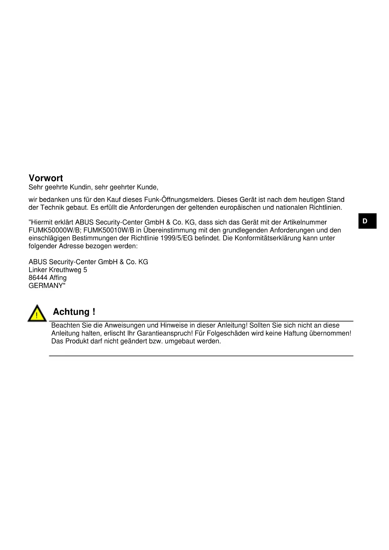 "Hiermit erklärt ABUS Security-Center GmbH & Co. KG, dass sich das Gerät mit der Artikelnummer FUMK50000W/B; FUMK50010W/B in Übereinstimmung mit den grundlegenden Anforderungen und den einschlägigen Bestimmungen der Richtlinie 1999/5/EG befindet. Die Konformitätserklärung kann unter folgender Adresse bezogen werden:
