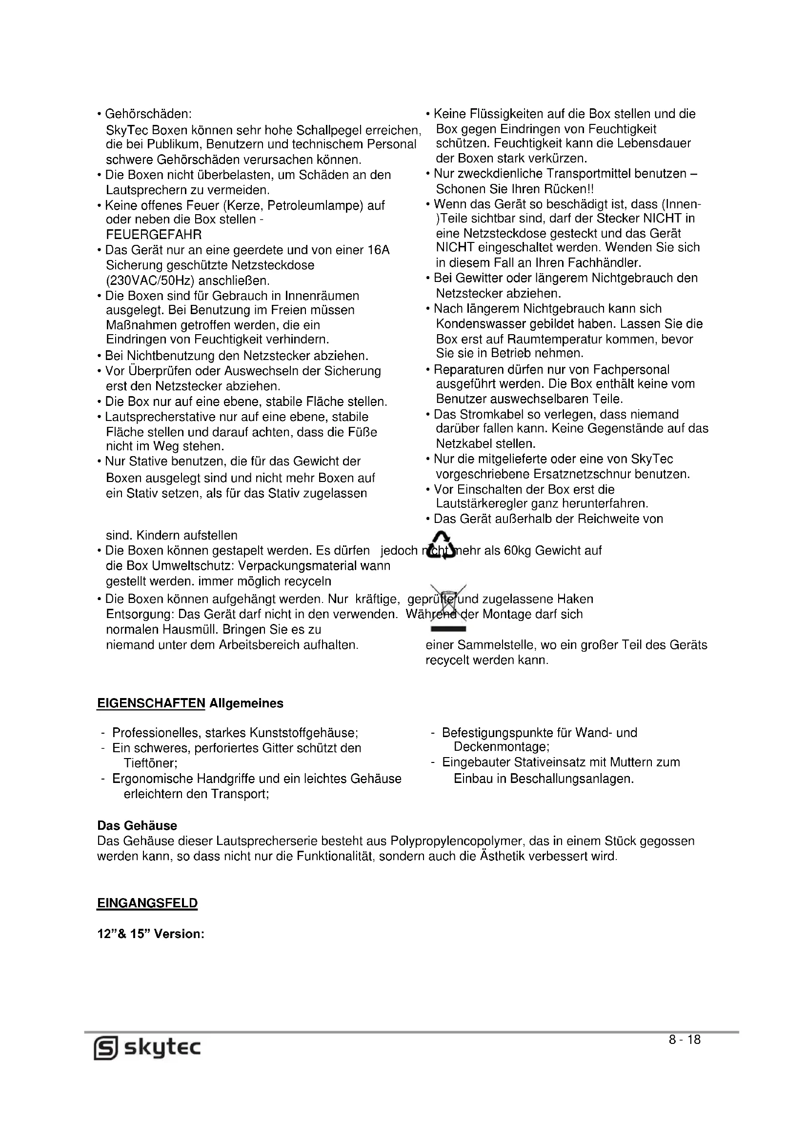 SkyTec Boxen können sehr hohe Schallpegel erreichen, die bei Publikum, Benutzern und technischem Personal schwere Gehörschäden verursachen können. - Die Boxen nicht überbelasten, um Schäden an den Lautsprechern zu vermeiden.