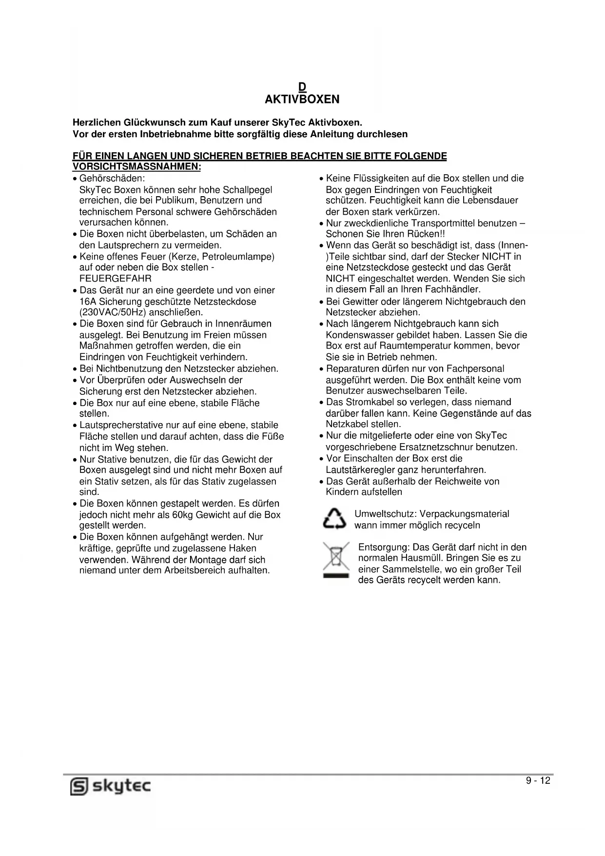 Herzlichen Glückwunsch zum Kauf unserer SkyTec Aktivboxen. Vor der ersten Inbetriebnahmeitte sorgfaltigthese Anleitung durchlesen