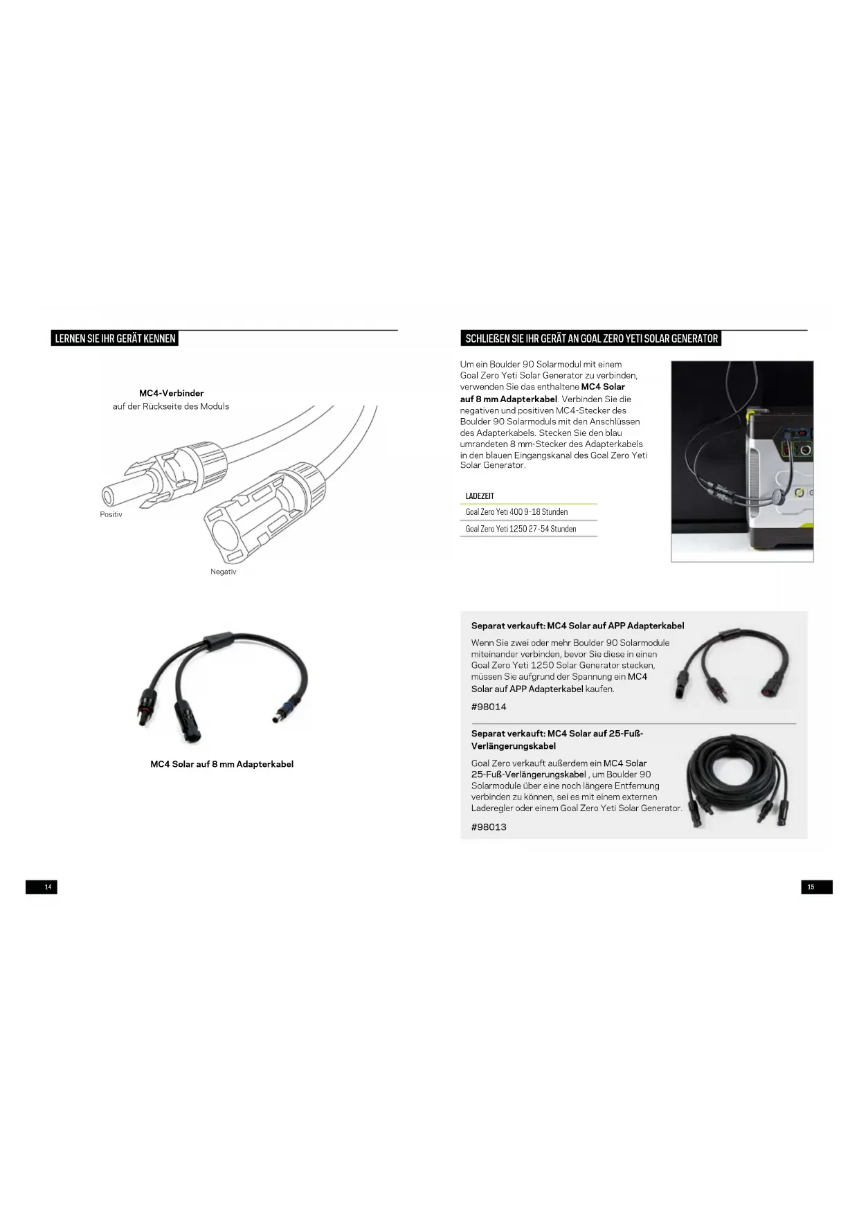 Negativ Positiv MC4 Solar auf 8mm Adapterkabel Um ein Boulder 90 Solarmodul mit einem Goal Zero Yeti Solar Generator zu verbinden, verwenden Sie das enthaltene MC4 Solar auf 8mm Adapterkabel. Verbinden Sie die negativen und positiven MC4-Stecker des Boulder 90 Solarmoduls mit den Anschlüssen des Adapterkabels. Stecken Sie den blau umrandeten 8mm-Stecker des Adapterkabels in den blauen Eingangskanal des Goal Zero Yeti Solar Generator. SCHLIEßEN SIE IHR GERÄT AN GOAL ZERO YETI SOLAR GENERATOR Separat verkauft: MC4 Solar auf APP Adapterkabel Wenn Sie zwei oder mehr Boulder 90 Solarmodule miteinander verbinden, bevor Sie diese in einen Goal Zero Yeti 1250 Solar Generator stecken, müssen Sie aufgrund der Spannung ein MC4 Solar auf APP Adapterkabel kaufen. #98014 LADEZEIT Goal Zero Yeti 400 9-18 Stunden Goal Zero Yeti 1250 27-54 Stunden Separat verkauft: MC4 Solar auf 25-Fuß- Verlängerungskabel Goal Zero verkauft außerdem ein MC4 Solar 25-Fuß-Verlängerungskabel , um Boulder 90 Solarmodule über eine noch längere Entfernung verbinden zu können, sei es mit einem externen Laderegler oder einem Goal Zero Yeti Solar Generator. #980131716