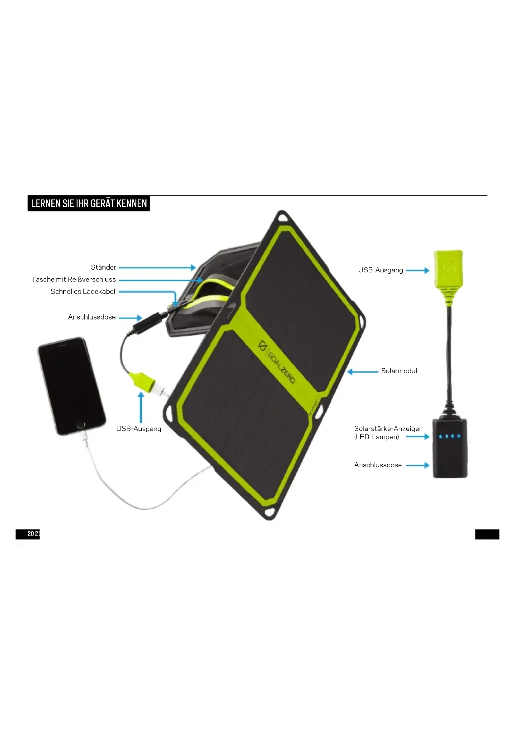 Die Intelligenz des Nomad 7 Plus sitzt in der Anschlussdose. Verschiedene Schlüsselkomponenten, darunter der Solarstärke- Anzeiger, arbeiten zusammen um zu garantieren, dass Sie die bestmögliche Solar-Lade-Erfahrung haben. Diese vier LED-Lampen zeigen die aktuellen Solarbedingungen an und geben Ihnen einen Eindruck, wie gut Ihre Ausrüstung laden wird. Sobald Sie den Nomad 7 Plus anschließen, blinken die Lampen der Ladegeschwindigkeit Ihrer Ausrüstung entsprechend. Sie denken, Sie sollten mehr Lampen sehen? Versuchen Sie, den Nomad 7 PLus neu in Richtung Sonne auszurichten, und beobachten Sie, wie sich die Lampen und die Anzeige der Ladegeschwindigkeit ändern. Die beste Ladebedingungen für Telefone und andere USB-betriebene Geräte bestehen bei drei oder mehr Lampen. STÄNDER Der Nomad 7 Plus verfügt über einen magnetischen, abnehmbaren Ständer, sodass Sie das Gewicht so leicht wie möglich halten können. Lassen Sie ihn befestigt und er springt heraus in einen optimalen Winkel für die Ausrichtung zur Sonne. Außerdem bietet er natürlichen Schatten und eine belüftete Tasche für angeschlossene Geräte. SPEICHERNSchließen Sie ein Ladegerät von Goal Zero oder ein Telefon am Modul an.SAMMELNSammeln Sie die Energie der Sonne mit dem Solarmodul. LADENLaden Sie Ausrüstung überall.