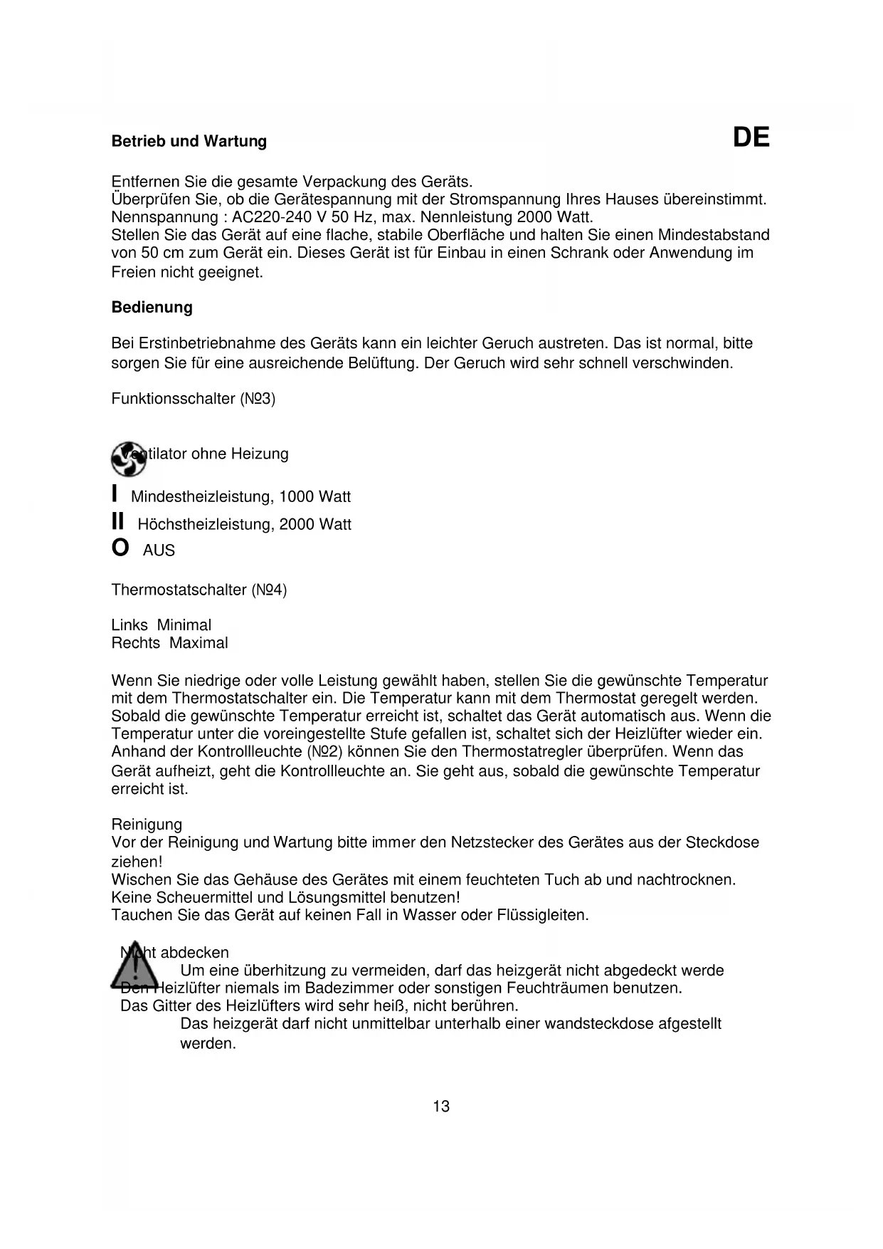 Emballage L'emballage est recyclable à 100%, mettez-le au rebut en le séparant des autres déchets. Produit Cette appareil est doté d'une marque en fonction de la Directive Européenne 2002.96/EC sur les Déchets d'Equipements Electriques et Electroniques (DEEE). En faisant en sorte que le produit soit traité de façon adéquate lors de sa mise au rebut vous pouvez contribuer à prévenir des effets néfastes pour la santé humaine et l'environnement. Déclaration de conformité CE Cet appareil est conçu, fabriqué et distribué en respectant les objectifs de sécurité de la Directive Basse Tension no 73/23/EEC, les exigences de protection de la Directive EMC 89/336/EC "Compatibilité Electromagnétique" et les exigences de la Directive 93/68/EEC.13 Betrieb und Wartung DE Entfernen Sie die gesamte Verpackung des Geräts. Überprüfen Sie, ob die Gerätespannung mit der Stromspannung Ihres Hauses übereinstimmt. Nennspannung : AC220-240 V 50 Hz, max. Nennleistung 2000 Watt. Stellen Sie das Gerät auf eine flache, stabile Oberfläche und halten Sie einen Mindestabstand von 50 cm zum Gerät ein. Dieses Gerät ist für Einbau in einen Schrank oder Anwendung im Freien nicht geeignet. Bedienung Bei Erstinbetriebnahme des Geräts kann ein leichter Geruch austreten. Das ist normal, bitte sorgen Sie für eine ausreichende Belüftung. Der Geruch wird sehr schnell verschwinden. Funktionsschalter (Nr.3)