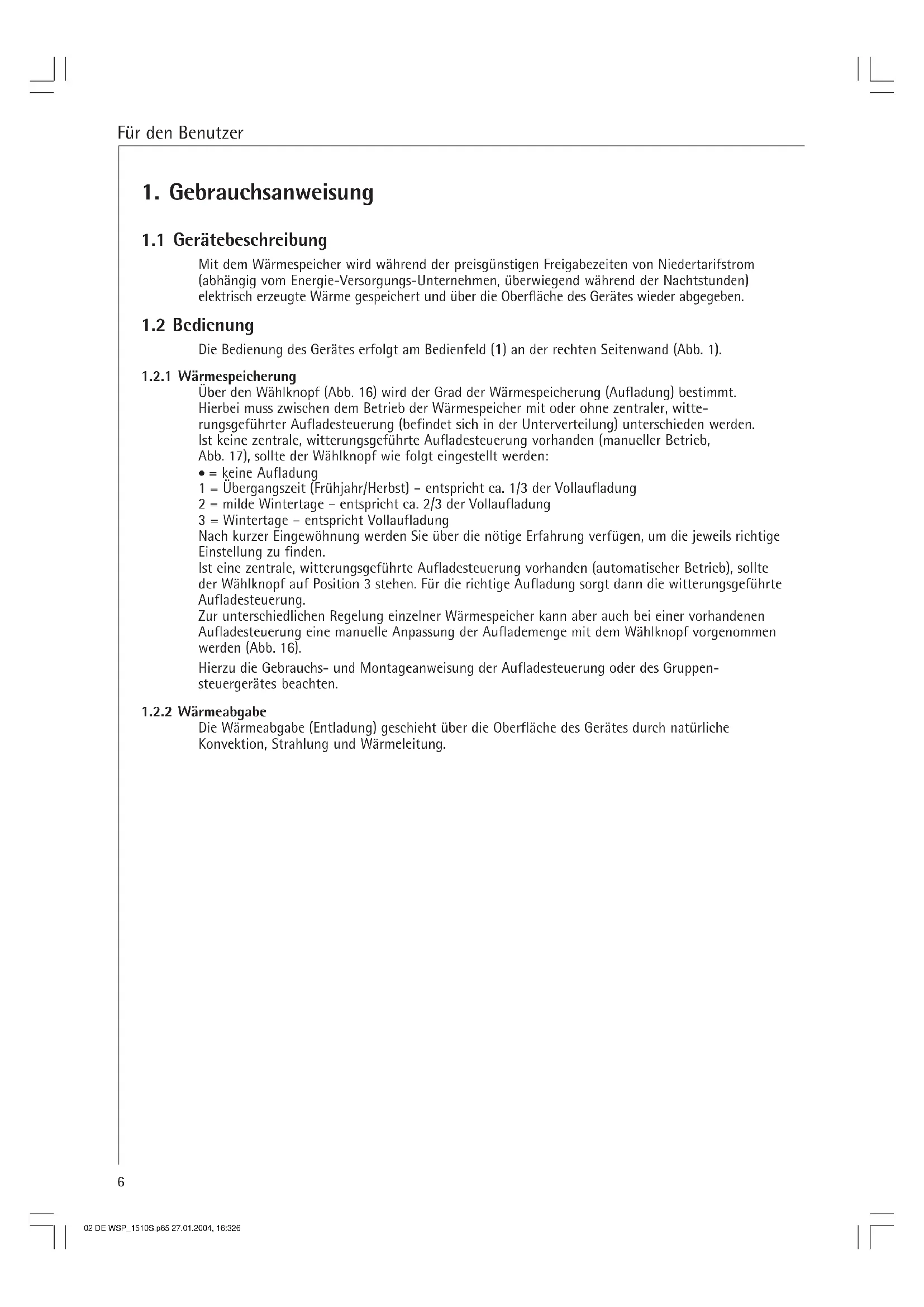 Die Speichersteine werden über die zwischen den Speichersteinreihen liegenden Heizkörper erwärmt. Mit dem Aufladeregler (Wählknopf Abb. 16) wird die Aufladung stufenlos eingestellt. Beginn und Dauer der Aufladezeit werden vom zuständigen Elektrizitätsversorgungs-Unternehmen (EVU) bestimmt. Ein eingebauter Schutz-Temperaturregler (17) sowie ein Sicherheits-Temperaturbegrenzer (18) verhindern eine Überhitzung des Gerätes. Während die Schutz-Temperaturregler sich selbsttätig wieder einschalten, muss der Sicherheits-Temperaturbegrenzer vom Fachmann durch Eindrücken des mittig am Begrenzer angeordneten Knopfes nach Behebung der Fehlerursache wieder eingeschaltet werden. Die so gespeicherte Wärme wird dann über die Geräteoberfläche durch natürliche Konvektion, Strahlung und Wärmeleitung wieder abgegeben.