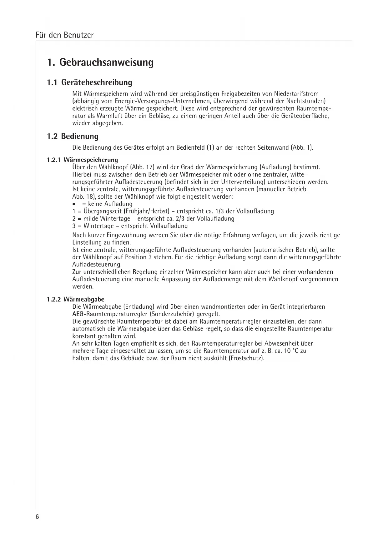 Die Wärmeabgabe (Entladung) wird über einen wandmontierten oder im Gerät integrierbaren AEG-Raumtemperaturregler (Sonderzubehör) geregelt. Die gewünschte Raumtemperatur ist dabei am Raumtemperaturregler einzustellen, der dann automatisch die Wärmeabgabe über das Gebläse regelt, so dass die eingestellte Raumtemperatur konstant gehalten wird. An sehr kalten Tagen empfiehlt es sich, den Raumtemperaturregler bei Abwesenheit über mehrere Tage eingeschaltet zu lassen, um so die Raumtemperatur auf z. B. ca. 10 °C zu halten, damit das Gebäude bzw. der Raum nicht auskühlt (Frostschutz). Für den Benutzer7 Deutsch
