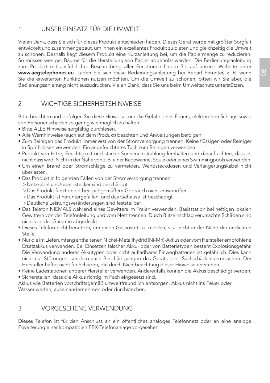 Vielen Dank, dass Sie sich für dieses Produkt entschieden haben. Dieses Gerät wurde mit größter Sorgfalt entwickelt und zusammengebaut, um Ihnen ein exzellentes Produkt zu bieten und gleichzeitig die Umwelt zu schonen. Deshalb liegt diesem Produkt eine Kurzanleitung bei, um die Papiermenge zu reduzieren. So müssen weniger Bäume für die Herstellung von Papier abgeholzt werden. Die Bedienungsanleitung zum Produkt mit ausführlicher Beschreibung aller Funktionen finden Sie auf unserer Website unter www.aegtelephones.eu. Laden Sie sich diese Bedienungsanleitung bei Bedarf herunter, z. B. wenn Sie die erweiterten Funktionen nutzen möchten. Um die Umwelt zu schonen, bitten wir Sie aber, die Bedienungsanleitung nicht auszudrucken. Vielen Dank, dass Sie uns beim Umweltschutz unterstützen.