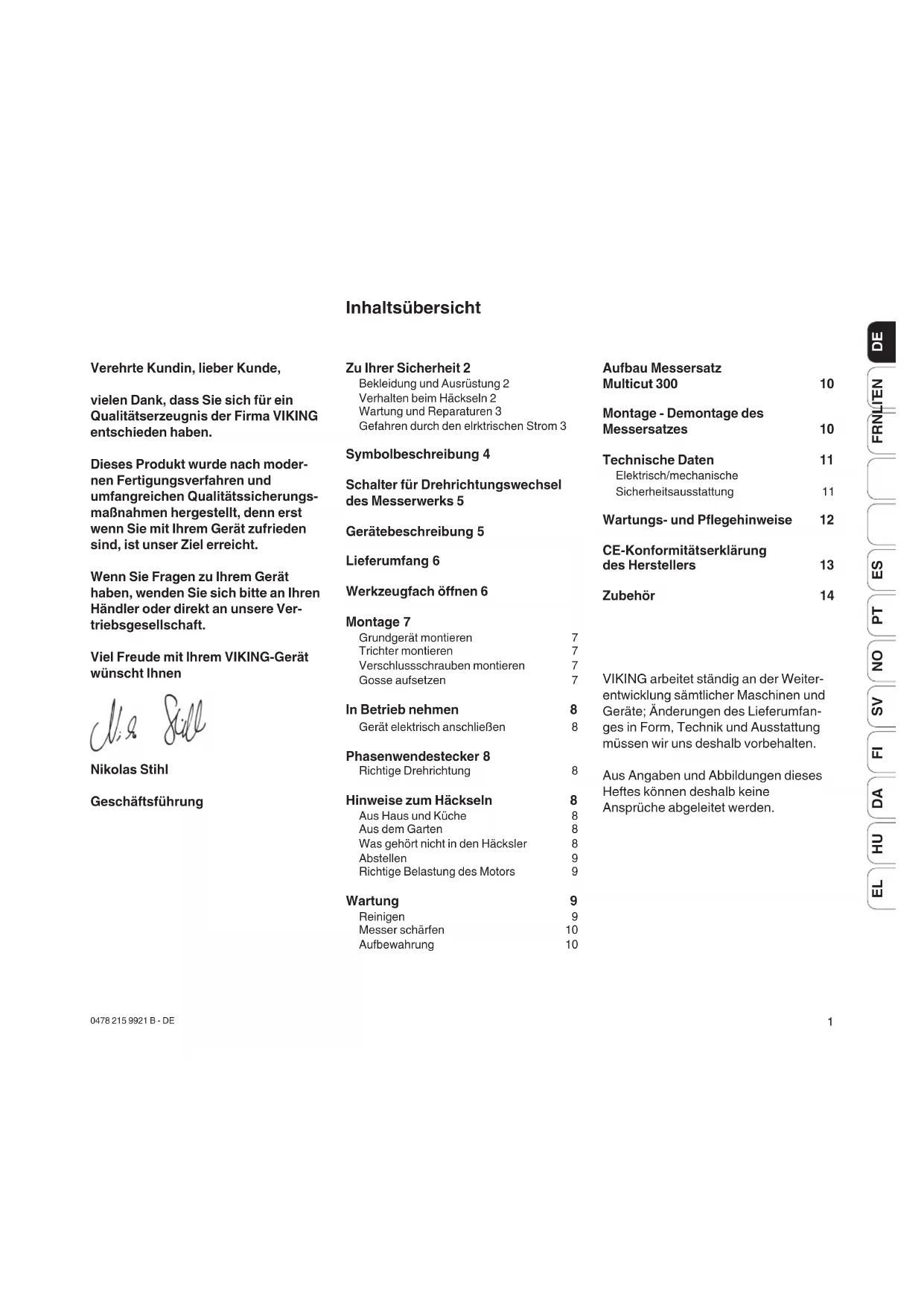 Verehrte Kundin, lieber Kunde, vielen Dank, dass Sie sich für ein Qualitätserzeugnis der Firma VIKING entschieden haben. Dieses Produkt wurde nach moder- nen Fertigungsverfahren und umfangreichen Qualitätssicherungs- maßnahmen hergestellt, denn erst wenn Sie mit Ihrem Gerät zufrieden sind, ist unser Ziel erreicht. Wenn Sie Fragen zu Ihrem Gerät haben, wenden Sie sich bitte an Ihren Händler oder direkt an unsere Ver- triebsgesellschaft. Viel Freude mit Ihrem VIKING-Gerät wünscht Ihnen Nikolas Stihl Geschäftsführung Inhaltsübersicht VIKING arbeitet ständig an der Weiter- entwicklung sämtlicher Maschinen und Geräte; Änderungen des Lieferumfan- ges in Form, Technik und Ausstattung müssen wir uns deshalb vorbehalten. Aus Angaben und Abbildungen dieses Heftes können deshalb keine Ansprüche abgeleitet werden.
