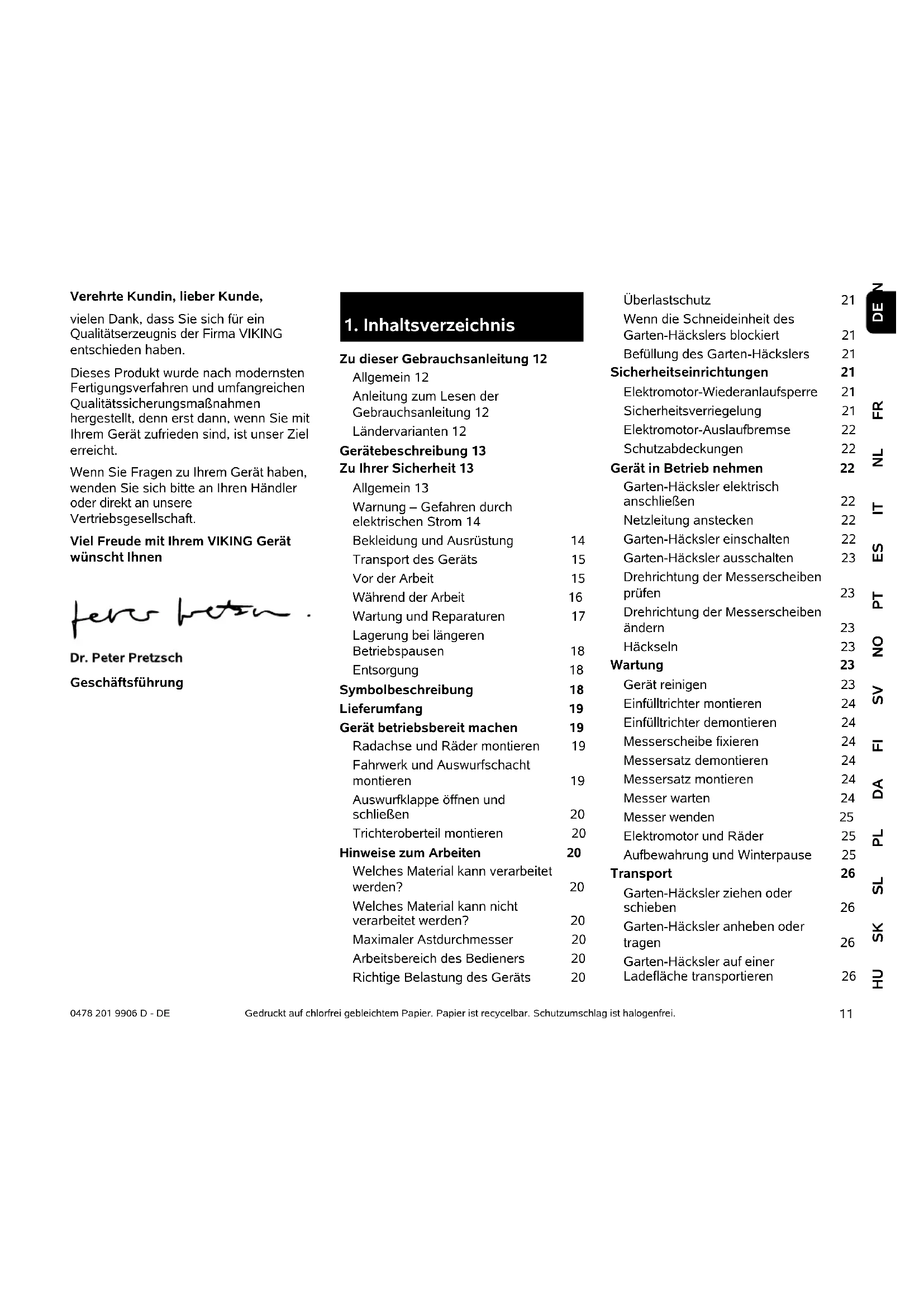Zu dieser Gebrauchsanleitung 12 Allgemein 12 Anleitung zum Lesen der Gebrauchsanleitung 12 Ländervarianten 12 Gerätebeschreibung 13 Zu Ihrer Sicherheit 13 Allgemein 13 Warnung – Gefahren durch elektrischen Strom 14 Bekleidung und Ausrüstung 14 Transport des Geräts 15 Vor der Arbeit 15 Während der Arbeit 16 Wartung und Reparaturen 17 Lagerung bei längeren Betriebspausen 18 Entsorgung 18 Symbolbeschreibung 18 Lieferumfang 19 Gerät betriebsbereit machen 19 Radachse und Räder montieren 19 Fahrwerk und Auswurfschacht montieren 19 Auswurfklappe öffnen und schließen 20 Trichteroberteil montieren 20 Hinweise zum Arbeiten 20 Welches Material kann verarbeitet werden? 20 Welches Material kann nicht verarbeitet werden? 20 Maximaler Astdurchmesser 20 Arbeitsbereich des Bedieners 20 Richtige Belastung des Geräts 20 Überlastschutz 21 Wenn die Schneideinheit des Garten-Häckslers blockiert 21 Befüllung des Garten-Häckslers 21 Sicherheitseinrichtungen 21 Elektromotor-Wiederanlaufsperre 21 Sicherheitsverriegelung 21 Elektromotor-Auslaufbremse 22 Schutzabdeckungen 22 Gerät in Betrieb nehmen 22 Garten-Häcksler elektrisch anschließen 22 Netzleitung anstecken 22 Garten-Häcksler einschalten 22 Garten-Häcksler ausschalten 23 Drehrichtung der Messerscheiben prüfen 23 Drehrichtung der Messerscheiben ändern 23 Häckseln 23 Wartung 23 Gerät reinigen 23 Einfülltrichter montieren 24 Einfülltrichter demontieren 24 Messerscheibe fixieren 24 Messersatz demontieren 24 Messersatz montieren 24 Messer warten 24 Messer wenden 25 Elektromotor und Räder 25 Aufbewahrung und Winterpause 25 Transport 26 Garten-Häcksler ziehen oder schieben 26 Garten-Häcksler anheben oder tragen 26 Garten-Häcksler auf einer Ladefläche transportieren 260478 201 9906 D - DE