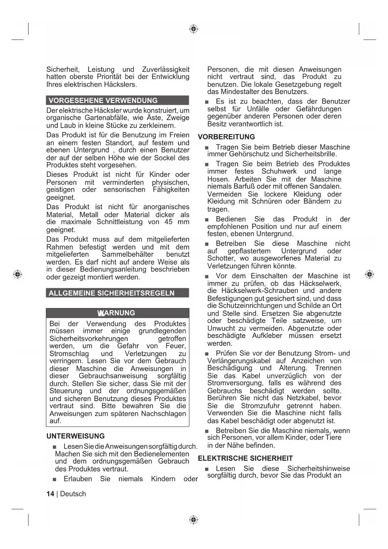 Sans symbole d'alerte de sécurité Indique une situation pouvant entraîner des dommages matériels.14 | Deutsch Sicherheit, Leistung und Zuverlässigkeit hatten oberste Priorität bei der Entwicklung Ihres elektrischen Häckslers. VORGESEHENE VERWENDUNG Der elektrische Häcksler wurde konstruiert, um organische Gartenabfälle, wie Äste, Zweige und Laub in kleine Stücke zu zerkleinern. Das Produkt ist für die Benutzung im Freien an einem festen Standort, auf festem und ebenen Untergrund , durch einen Benutzer der auf der selben Höhe wie der Sockel des Produktes steht vorgesehen. Dieses Produkt ist nicht für Kinder oder Personen mit verminderten physischen, geistigen oder sensorischen Fähigkeiten geeignet. Das Produkt ist nicht für anorganisches Material, Metall oder Material dicker als die maximale Schnittleistung von 45 mm geeignet. Das Produkt muss auf dem mitgelieferten Rahmen befestigt werden und mit dem mitgelieferten Sammelbehälter benutzt werden. Es darf nicht auf andere Weise als in dieser Bedienungsanleitung beschrieben oder gezeigt montiert werden. ALLGEMEINE SICHERHEITSREGELN WARNUNG Bei der Verwendung des Produktes müssen immer einige grundlegenden Sicherheitsvorkehrungen getroffen werden, um die Gefahr von Feuer, Stromschlag und Verletzungen zu verringern. Lesen Sie vor dem Gebrauch dieser Maschine die Anweisungen in dieser Gebrauchsanweisung sorgfältig durch. Stellen Sie sicher, dass Sie mit der Steuerung und der ordnungsgemäßen und sicheren Benutzung dieses Produktes vertraut sind. Bitte bewahren Sie die Anweisungen zum späteren Nachschlagen auf. UNTERWEISUNG ■ Lesen Sie die Anweisungen sorgfältig durch. Machen Sie sich mit den Bedienelementen und dem ordnungsgemäßen Gebrauch des Produktes vertraut. ■ Erlauben Sie niemals Kindern oder Personen, die mit diesen Anweisungen nicht vertraut sind, das Produkt zu benutzen. Die lokale Gesetzgebung regelt das Mindestalter des Benutzers. ■ Es ist zu beachten, dass der Benutzer selbst für Unfälle oder Gefährdungen gegenüber anderen Personen oder deren Besitz verantwortlich ist. VORBEREITUNG ■ Tragen Sie beim Betrieb dieser Maschine immer Gehörschutz und Sicherheitsbrille. ■ Tragen Sie beim Betrieb des Produktes immer festes Schuhwerk und lange Hosen. Arbeiten Sie mit der Maschine niemals Barfuß oder mit offenen Sandalen. Vermeiden Sie lockere Kleidung oder Kleidung mit Schnüren oder Bändern zu tragen. ■ Bedienen Sie das Produkt in der empfohlenen Position und nur auf einem festen, ebenen Untergrund. ■ Betreiben Sie diese Maschine nicht auf gepflastertem Untergrund oder Schotter, wo ausgeworfenes Material zu Verletzungen führen könnte. ■ Vor dem Einschalten der Maschine ist immer zu prüfen, ob das Häckselwerk, die Häckselwerk-Schrauben und andere Befestigungen gut gesichert sind, und dass die Schutzeinrichtungen und Schilde an Ort und Stelle sind. Ersetzen Sie abgenutzte oder beschädigte Teile satzweise, um Unwucht zu vermeiden. Abgenutzte oder beschädigte Aufkleber müssen ersetzt werden. ■ Prüfen Sie vor der Benutzung Strom- und Verlängerungskabel auf Anzeichen von Beschädigung und Alterung. Trennen Sie das Kabel unverzüglich von der Stromversorgung, falls es während des Gebrauchs beschädigt werden sollte. Berühren Sie nicht das Netzkabel, bevor Sie die Stromzufuhr getrennt haben. Verwenden Sie die Maschine nicht falls das Kabel beschädigt oder abgenutzt ist. ■ Betreiben Sie die Maschine niemals, wenn sich Personen, vor allem Kinder, oder Tiere in der Nähe befinden. ELEKTRISCHE SICHERHEIT ■ Lesen Sie diese Sicherheitshinweise sorgfältig durch, bevor Sie das Produkt an15 Deutsch |