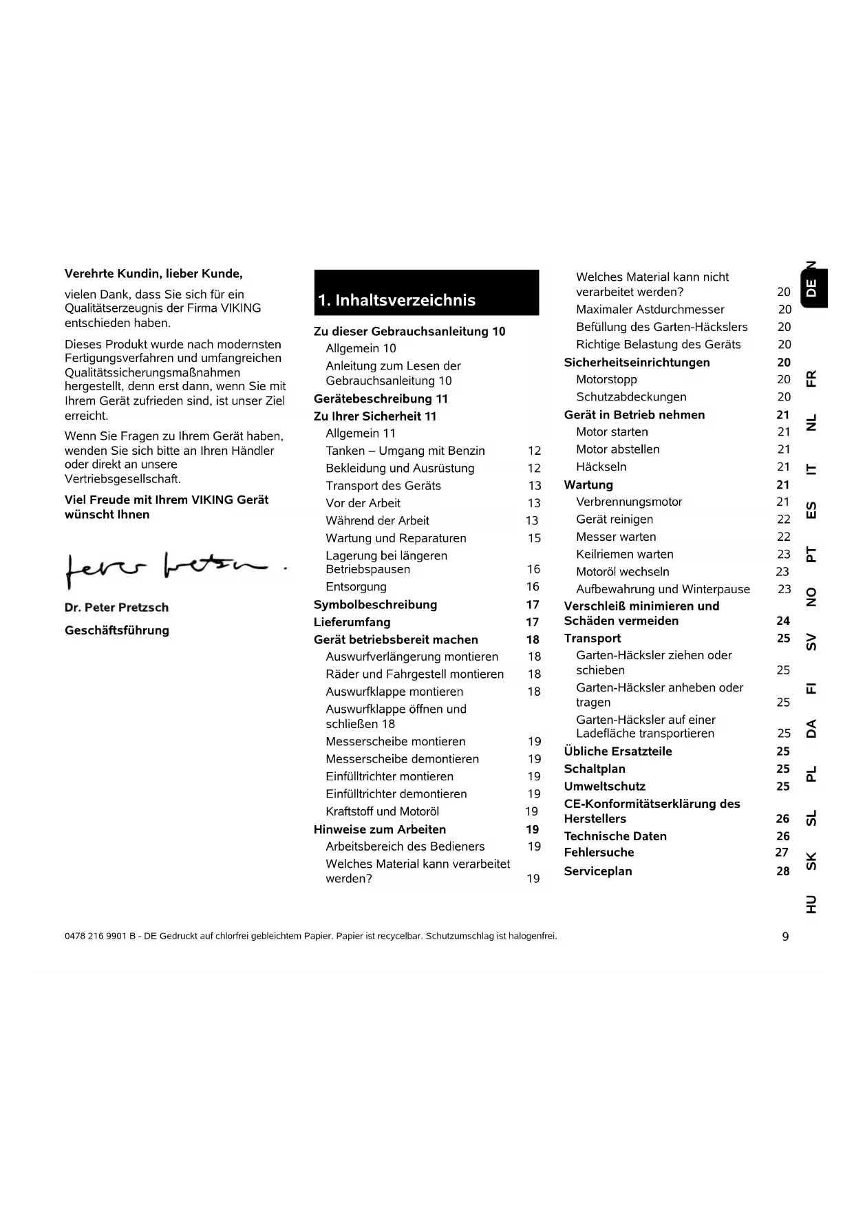 FRNLITESPTNOSVFIDAPLSLSKHU 0478 216 9901 B - DE Gedruckt auf chlorfrei gebleichtem Papier. Papier ist recycelbar. Schutzumschlag ist halogenfrei. Verehrte Kundin, lieber Kunde, vielen Dank, dass Sie sich für ein Qualitätserzeugnis der Firma VIKING entschieden haben. Dieses Produkt wurde nach modernsten Fertigungsverfahren und umfangreichen Qualitätssicherungsmaßnahmen hergestellt, denn erst dann, wenn Sie mit Ihrem Gerät zufrieden sind, ist unser Ziel erreicht. Wenn Sie Fragen zu Ihrem Gerät haben, wenden Sie sich bitte an Ihren Händler oder direkt an unsere Vertriebsgesellschaft. Viel Freude mit Ihrem VIKING Gerät wünscht Ihnen Geschäftsführung
