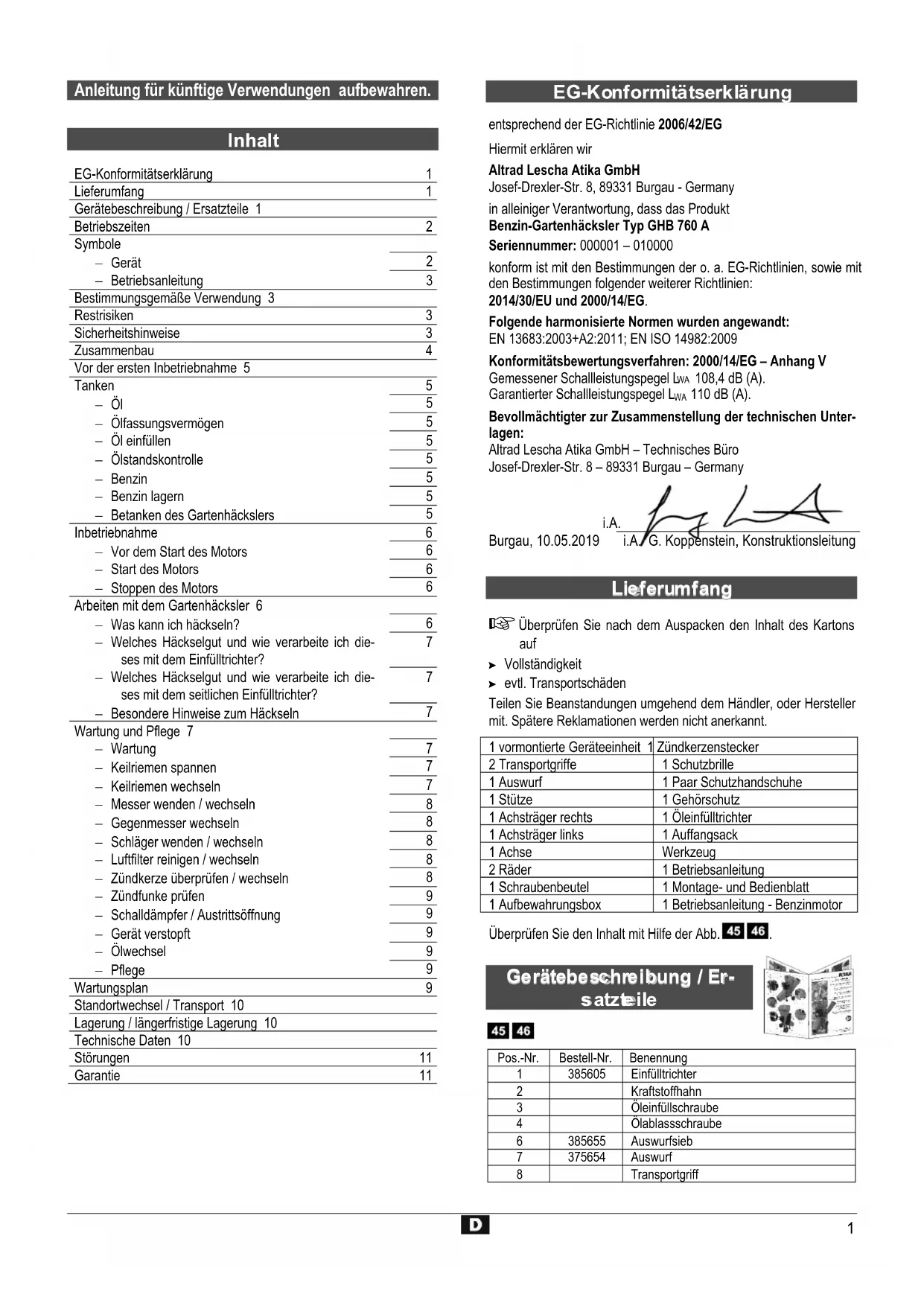 entsprechend der EG-Richtlinie 2006/42/EG Hiermit erklären wir Altrad Lescha Atika GmbH Josef-Drexler-Str. 8, 89331 Burgau - Germany in alleiniger Verantwortung, dass das Produkt Benzin-Gartenhäcksler Typ GHB 760 A Seriennummer: 000001 – 010000 konform ist mit den Bestimmungen der o. a. EG-Richtlinien, sowie mit den Bestimmungen folgender weiterer Richtlinien: 2014/30/EU und 2000/14/EG. Folgende harmonisierte Normen wurden angewandt:
