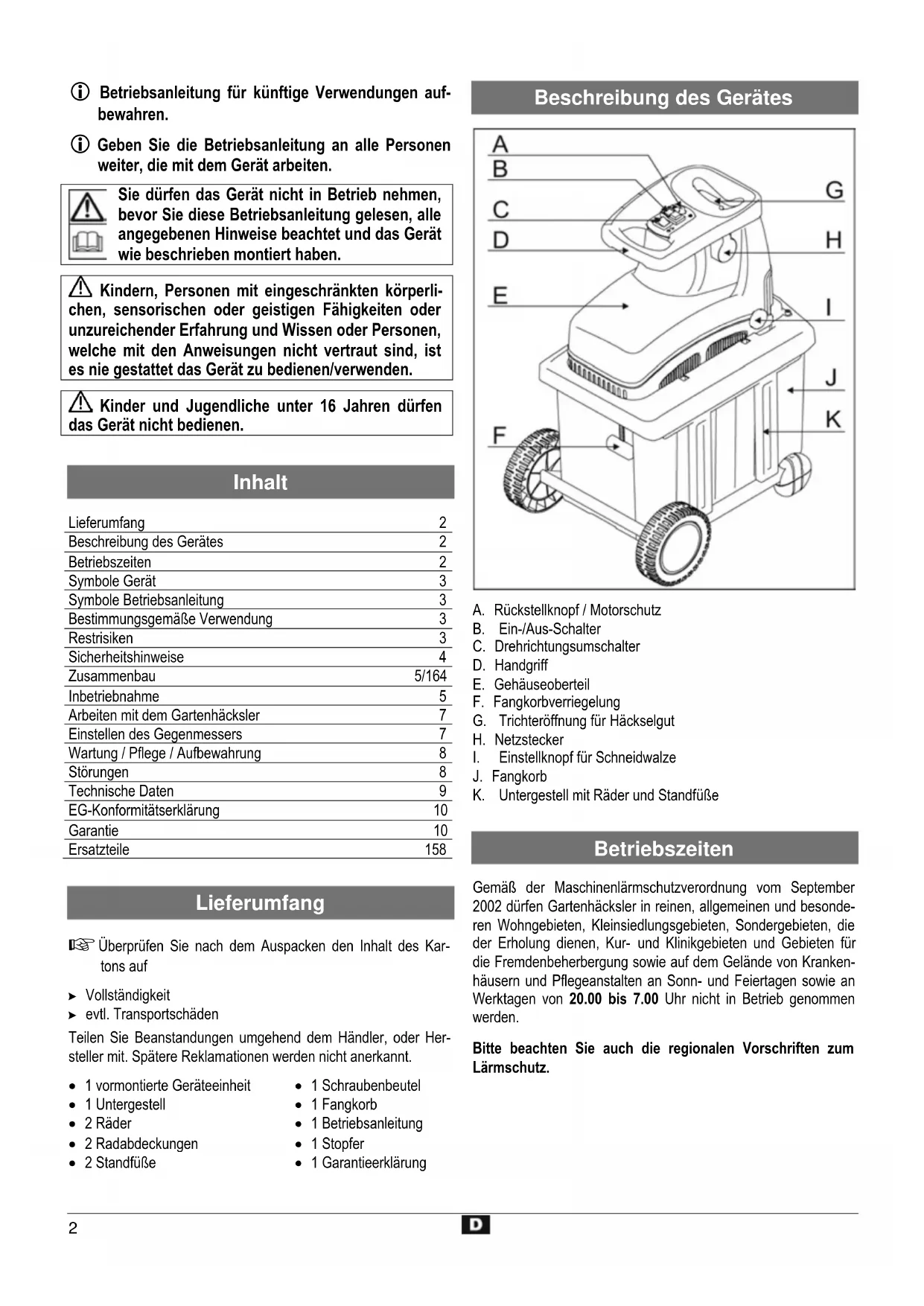 Betriebszeiten Gemäß der Maschinenlärmschutzverordnung vom September 2002 dürfen Gartenhäcksler in reinen, allgemeinen und besonde- ren Wohngebieten, Kleinsiedlungsgebieten, Sondergebieten, die der Erholung dienen, Kur- und Klinikgebieten und Gebieten für die Fremdenbeherbergung sowie auf dem Gelände von Kranken- häusern und Pflegeanstalten an Sonn- und Feiertagen sowie an Werktagen von 20.00 bis 7.00 Uhr nicht in Betrieb genommen werden. Bitte beachten Sie auch die regionalen Vorschriften zum Lärmschutz.3 Symbole Gerät