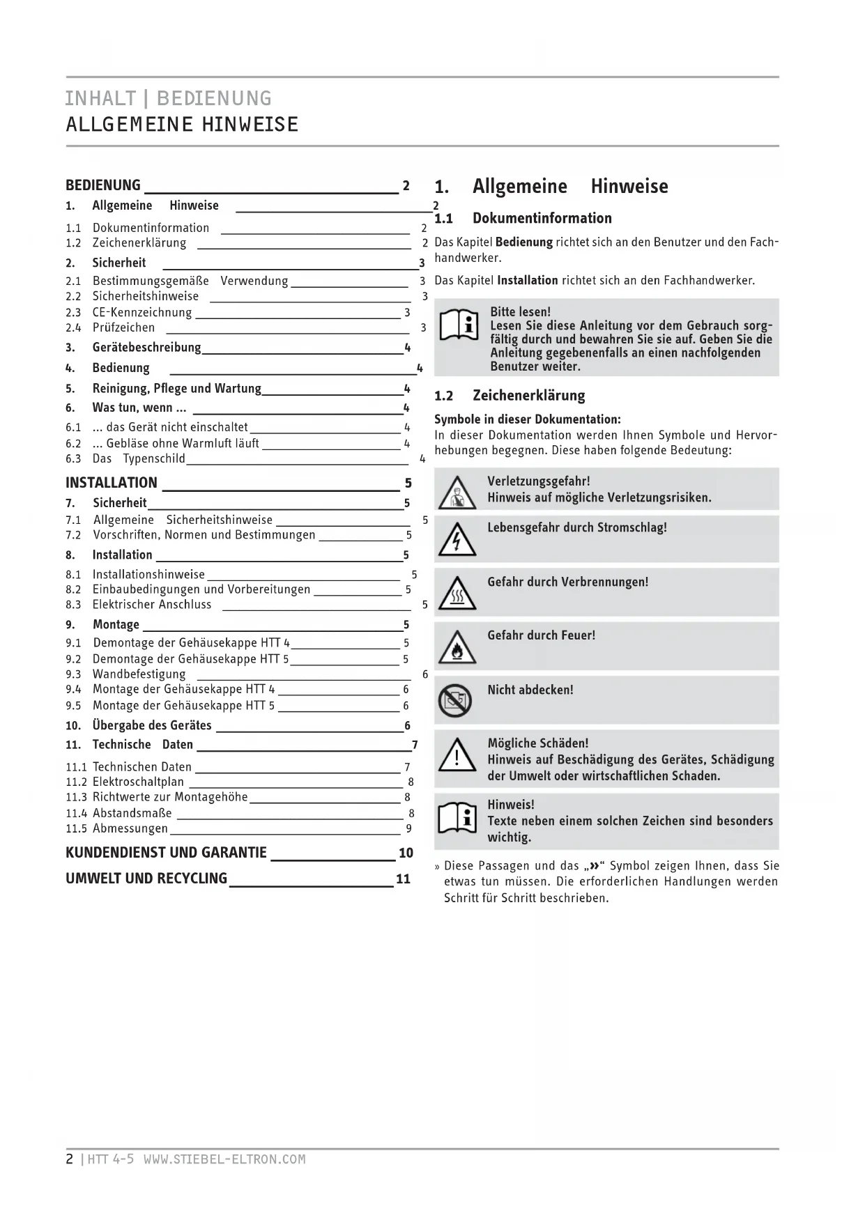 Erklären Sie dem Benutzer die Funktionen des Gerätes. Machen Sie ihn besonders auf die Sicherheitshinweise aufmerksam. Über- reichen Sie dem Benutzer die Bedienungs- und Installationsan- leitung.WWW.STIEBEL-ELTRON.COM HTT 4-5 |7 DEUTSCH INSTALLATION TECHNISCHE DATEN