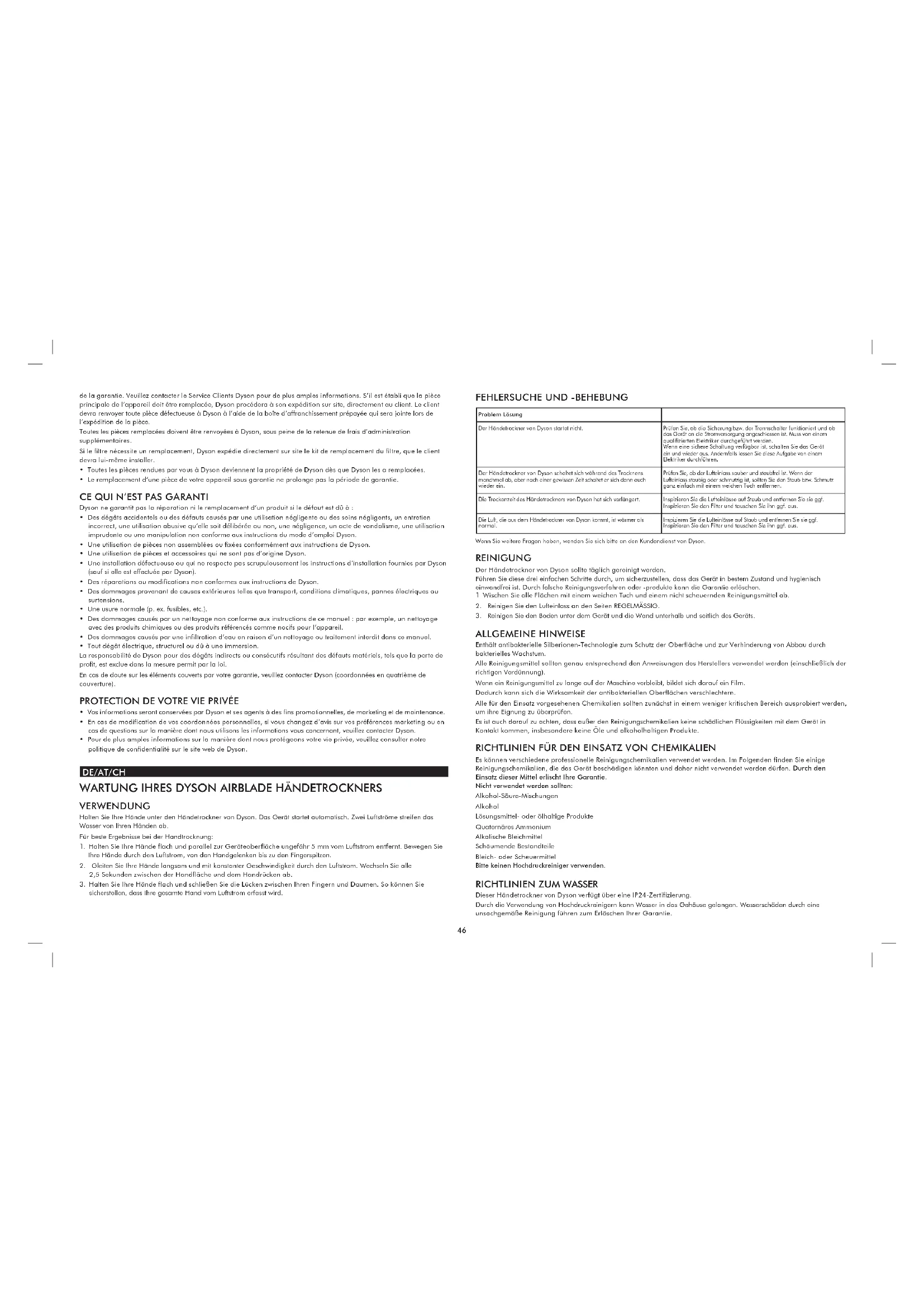 Damit wir Ihnen schnellen und effizienten Service bieten können, registrieren Sie Ihr Gerät bitte unter www.dysonairblade.com Dadurch registrieren Sie Ihre Garantie, bestätigen sich selbst als Eigentümer Ihres Dyson Geräts für den Fall eines Versicherungsschadens und ermöglichen es uns, bei Bedarf mit Ihnen Kontakt aufzunehmen. Sie benötigen hierzu Ihre Seriennummer, die Sie auf dem Typenschild am Sockel Ihres Geräts, auf dem Registrierungsblatt im Karton sowie nach dem Auspacken auf dem großen Info-Aufkleber an der Vorderseite der Verpackung finden. Bitte vergewissern Sie sich, dass alle Anweisungen und Erläuterungen in dieser Bedienungsanleitung eingehalten werden, da sonst die Garantie für das Gerät erlischt. IHRE GARANTIE ALLGEMEINE BEDINGUNGEN DER AUF 5 JAHRE BEGRENZTEN DYSON GARANTIE Wenn Sie Ihr Gerät online registriert haben, beginnt Ihre Gewährleistung ab dem Kaufdatum zu laufen. Bitte bewahren Sie Ihren Kaufnachweis auf. Wenn Sie keinen Kaufnachweis vorlegen können, beginnt Ihre Gewährleistung 90 Tage nach dem Fertigungsdatum entsprechend den Aufzeichnungen von Dyson.48 Wenn dieses Gerät innerhalb der EU verkauft wird, gilt diese Gewährleistung nur, (i) wenn das Gerät in dem Land, in dem es verkauft wurde, eingerichtet und verwendet wird oder (ii) wenn das Gerät in Belgien, Deutschland, Frankreich, Großbritannien, Irland, Italien, den Niederlanden, Österreich oder Spanien eingerichtet und verwendet wird und das gleiche Modell wie dieses Gerät mit der gleichen Nennspannung im jeweiligen Land verkauft wird. Wenn dieses Gerät außerhalb der EU verkauft wird, gilt diese Gewährleistung nur, wenn das Gerät in dem Land, in dem es verkauft wurde, eingerichtet und verwendet wird.
