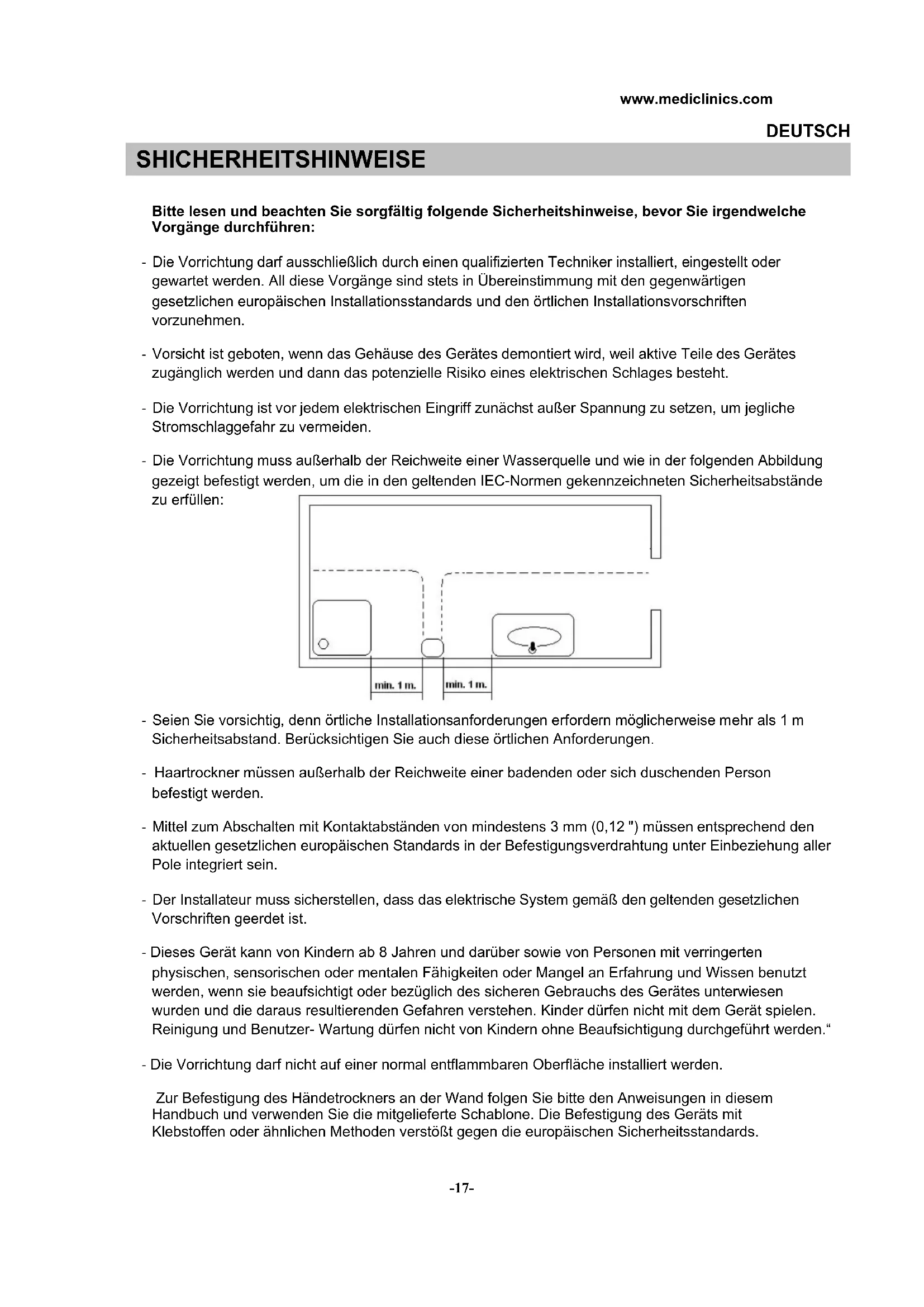 - Seien Sie vorsichtig, denn örtliche Installationsanforderungen erfordern möglicherweise mehr als 1 m Sicherheitsabstand. Berücksichtigen Sie auch diese örtlichen Anforderungen. - Haartrockner müssen außerhalb der Reichweite einer badenden oder sich duschenden Person befestigt werden. - Mittel zum Abschalten mit Kontaktabständen von mindestens 3 mm (0,12 ") müssen entsprechend den aktuellen gesetzlichen europäischen Standards in der Befestigungsverdrahtung unter Einbeziehung aller Pole integriert sein. - Der Installateur muss sicherstellen, dass das elektrische System gemäß den geltenden gesetzlichen Vorschriften geerdet ist. - Dieses Gerät kann von Kindern ab 8 Jahren und darüber sowie von Personen mit verringerten physischen, sensorischen oder mentalen Fähigkeiten oder Mangel an Erfahrung und Wissen benutzt werden, wenn sie beaufsichtigt oder bezüglich des sicheren Gebrauchs des Gerätes unterwiesen wurden und die daraus resultierenden Gefahren verstehen. Kinder dürfen nicht mit dem Gerät spielen. Reinigung und Benutzer- Wartung dürfen nicht von Kindern ohne Beaufsichtigung durchgeführt werden.“ - Die Vorrichtung darf nicht auf einer normal entflammbaren Oberfläche installiert werden. Zur Befestigung des Händetrockners an der Wand folgen Sie bitte den Anweisungen in diesem Handbuch und verwenden Sie die mitgelieferte Schablone. Die Befestigung des Geräts mit Klebstoffen oder ähnlichen Methoden verstößt gegen die europäischen Sicherheitsstandards. SHICHERHEITSHINWEISE