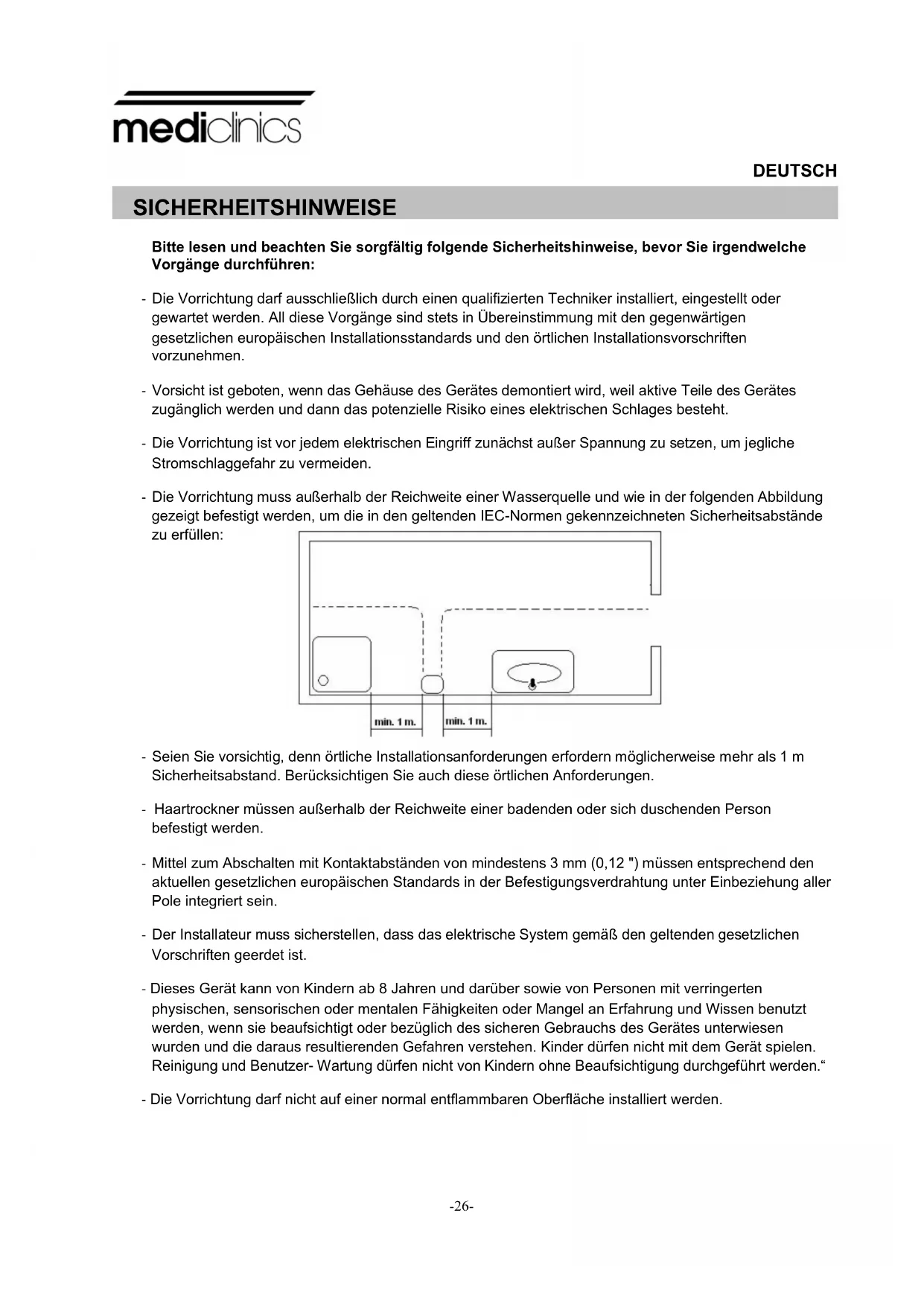- Seien Sie vorsichtig, denn örtliche Installationsanforderungen erfordern möglicherweise mehr als 1 m Sicherheitsabstand. Berücksichtigen Sie auch diese örtlichen Anforderungen. - Haartrockner müssen außerhalb der Reichweite einer badenden oder sich duschenden Person befestigt werden. - Mittel zum Abschalten mit Kontaktabständen von mindestens 3 mm (0,12 ") müssen entsprechend den aktuellen gesetzlichen europäischen Standards in der Befestigungsverdrahtung unter Einbeziehung aller Pole integriert sein. - Der Installateur muss sicherstellen, dass das elektrische System gemäß den geltenden gesetzlichen Vorschriften geerdet ist. - Dieses Gerät kann von Kindern ab 8 Jahren und darüber sowie von Personen mit verringerten physischen, sensorischen oder mentalen Fähigkeiten oder Mangel an Erfahrung und Wissen benutzt werden, wenn sie beaufsichtigt oder bezüglich des sicheren Gebrauchs des Gerätes unterwiesen wurden und die daraus resultierenden Gefahren verstehen. Kinder dürfen nicht mit dem Gerät spielen. Reinigung und Benutzer- Wartung dürfen nicht von Kindern ohne Beaufsichtigung durchgeführt werden.“ - Die Vorrichtung darf nicht auf einer normal entflammbaren Oberfläche installiert werden. SICHERHEITSHINWEISE