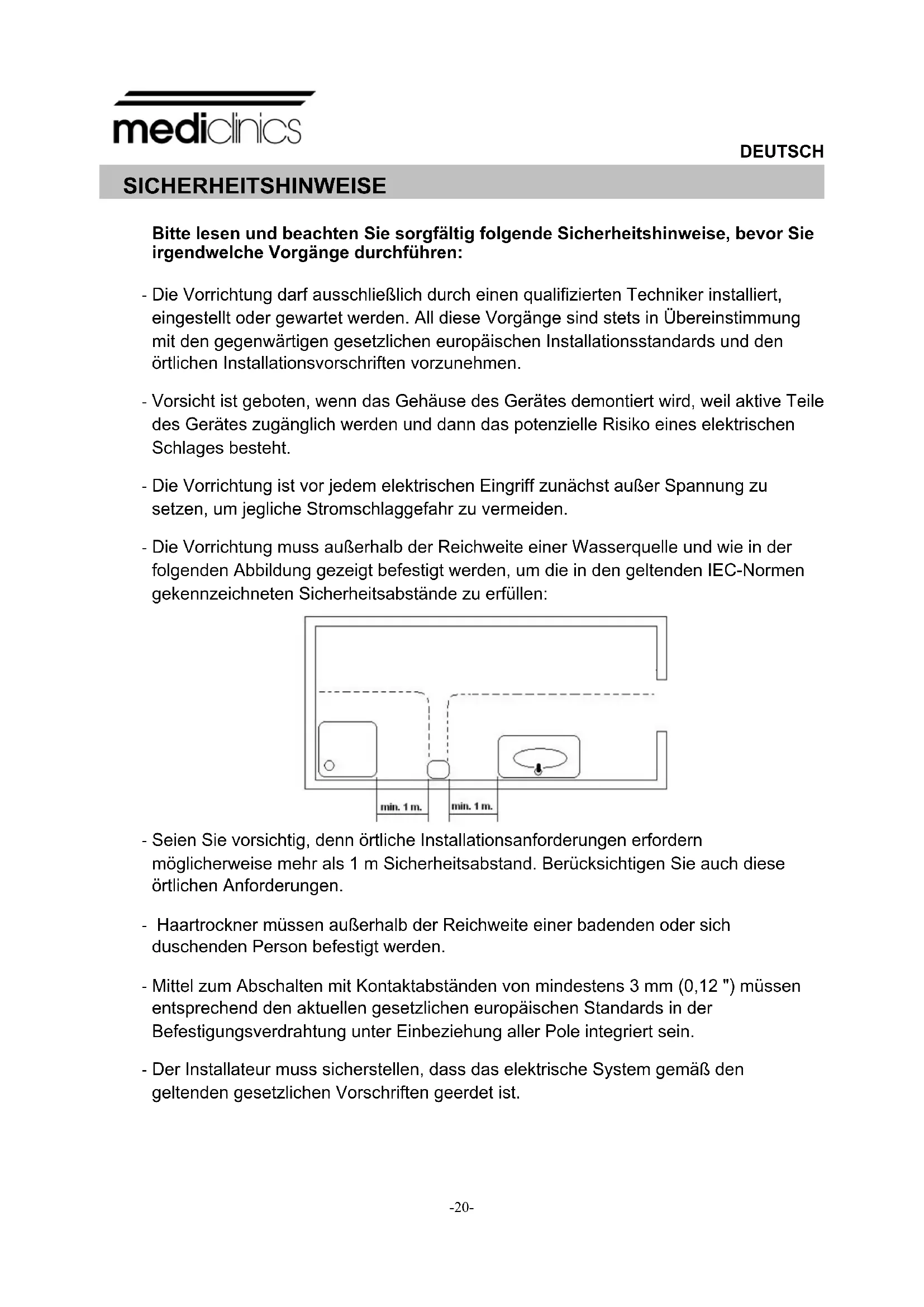 Die feste Installation muß von dem Anschlussgerät Abschaltungmittel einfügen, die mindestens 3 mm von allen den Polen entfernt sind. Bei der Installation sind die Schutzzonen gemäß VDE 0100 zu berücksichtigen. Der Händetrockner darf ausschließlich auf einer geschlossenen Oberfläche installiert werden (Mauer, Leichtbauwand oder ähnliches).www.mediclinics.com