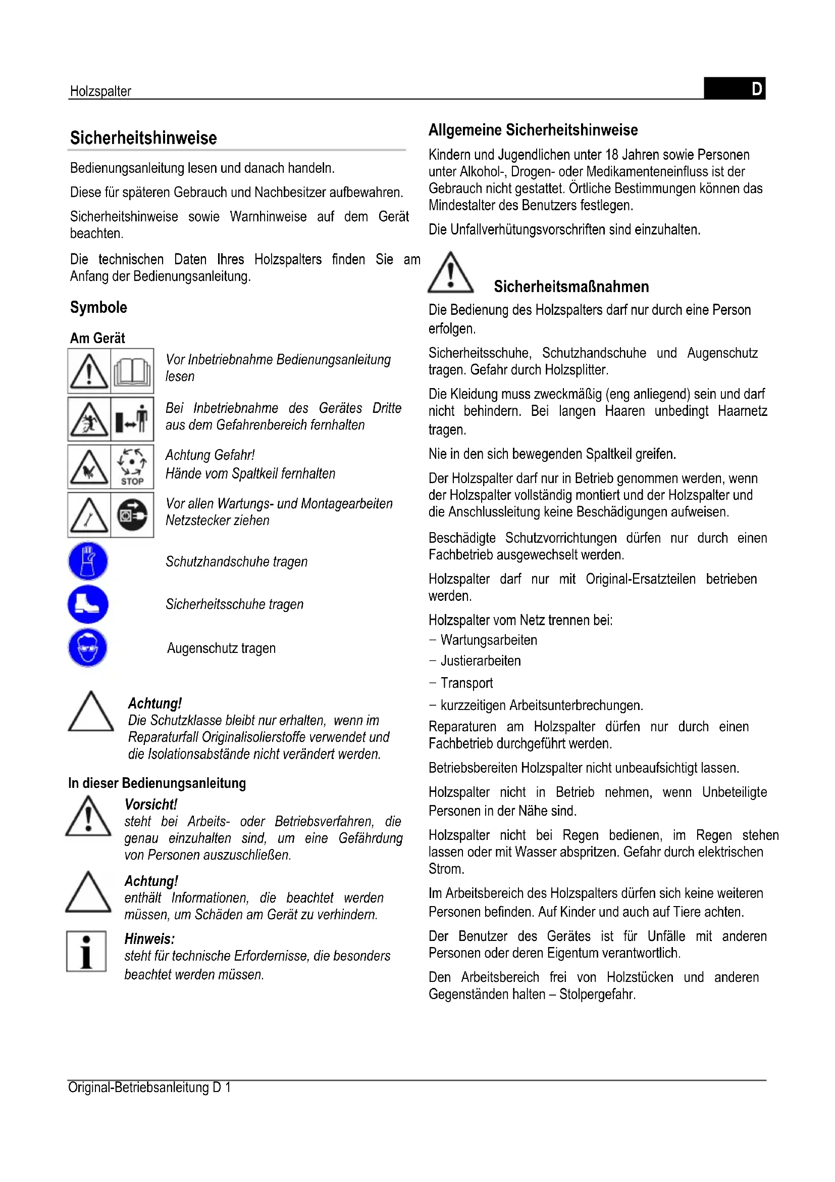 Sicherheitshinweise Bedienungsanleitung lesen und danach handeln. Diese für späteren Gebrauch und Nachbesitzer aufbewahren. Sicherheitshinweise sowie Warnhinweise auf dem Gerät beachten. Die technischen Daten Ihres Holzspalters finden Sie am Anfang der Bedienungsanleitung. Symbole Am Gerät Vor Inbetriebnahme Bedienungsanleitung lesen Bei Inbetriebnahme des Gerätes Dritte aus dem Gefahrenbereich fernhalten Achtung Gefahr! Hände vom Spaltkeil fernhalten Vor allen Wartungs- und Montagearbeiten Netzstecker ziehen Schutzhandschuhe tragen Sicherheitsschuhe tragen Augenschutz tragen Achtung! Die Schutzklasse bleibt nur erhalten, wenn im Reparaturfall Originalisolierstoffe verwendet und die Isolationsabstände nicht verändert werden. In dieser Bedienungsanleitung Vorsicht! steht bei Arbeits- oder Betriebsverfahren, die genau einzuhalten sind, um eine Gefährdung von Personen auszuschließen. Achtung! enthält Informationen, die beachtet werden müssen, um Schäden am Gerät zu verhindern. Hinweis: steht für technische Erfordernisse, die besonders beachtet werden müssen. Allgemeine Sicherheitshinweise Kindern und Jugendlichen unter 18 Jahren sowie Personen unter Alkohol-, Drogen- oder Medikamenteneinfluss ist der Gebrauch nicht gestattet. Örtliche Bestimmungen können das Mindestalter des Benutzers festlegen. Die Unfallverhütungsvorschriften sind einzuhalten. Sicherheitsmaßnahmen Die Bedienung des Holzspalters darf nur durch eine Person erfolgen. Sicherheitsschuhe, Schutzhandschuhe und Augenschutz tragen. Gefahr durch Holzsplitter. Die Kleidung muss zweckmäßig (eng anliegend) sein und darf nicht behindern. Bei langen Haaren unbedingt Haarnetz tragen. Nie in den sich bewegenden Spaltkeil greifen. Der Holzspalter darf nur in Betrieb genommen werden, wenn der Holzspalter vollständig montiert und der Holzspalter und die Anschlussleitung keine Beschädigungen aufweisen. Beschädigte Schutzvorrichtungen dürfen nur durch einen Fachbetrieb ausgewechselt werden. Holzspalter darf nur mit Original-Ersatzteilen betrieben werden. Holzspalter vom Netz trennen bei: − Wartungsarbeiten − Justierarbeiten − Transport − kurzzeitigen Arbeitsunterbrechungen. Reparaturen am Holzspalter dürfen nur durch einen Fachbetrieb durchgeführt werden. Betriebsbereiten Holzspalter nicht unbeaufsichtigt lassen. Holzspalter nicht in Betrieb nehmen, wenn Unbeteiligte Personen in der Nähe sind. Holzspalter nicht bei Regen bedienen, im Regen stehen lassen oder mit Wasser abspritzen. Gefahr durch elektrischen Strom. Im Arbeitsbereich des Holzspalters dürfen sich keine weiteren Personen befinden. Auf Kinder und auch auf Tiere achten. Der Benutzer des Gerätes ist für Unfälle mit anderen Personen oder deren Eigentum verantwortlich. Den Arbeitsbereich frei von Holzstücken und anderen Gegenständen halten – Stolpergefahr. Original-Betriebsanleitung D 1D Holzspalter Sicherheitseinrichtungen Motorschutzschalter Bei Überlastung des Holzspalters schaltet der Motorschutzschalter den Motor aus. Die Funktion des Motorschutzschalters darf nicht außer Kraft gesetzt werden. Hat der Motorschutzschalter den Holzspalter ausgeschaltet, wie folgt handeln: