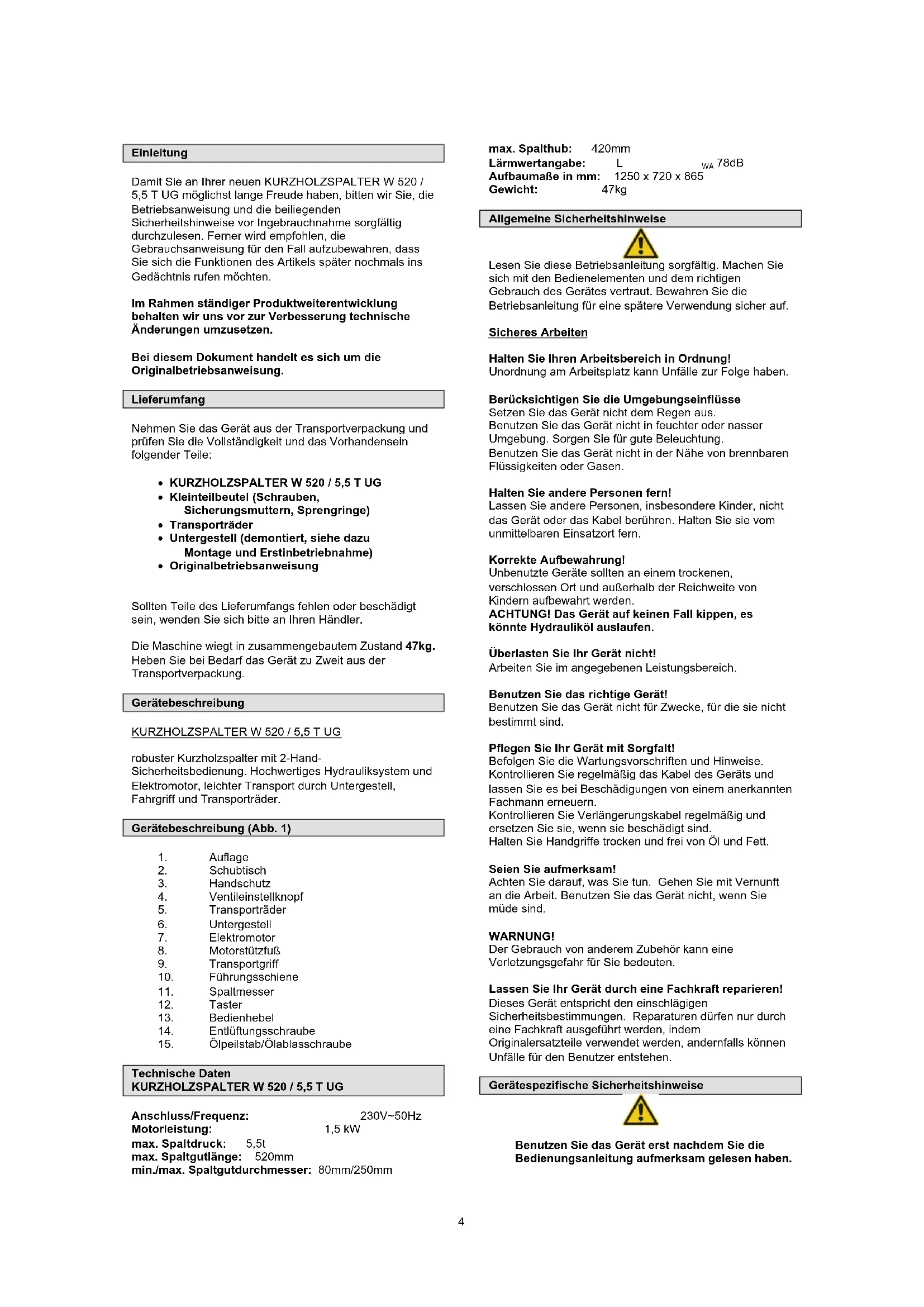 Damit Sie an ihrer neuen KURZHOLZSPALTER W 520 / 5,5 T UG möglichst lange Freude haben, bitten wir Sie, die Betriebsanweisung und die beiliegenden Sicherheitseinweise vor Ingebrauchnahme sorgfältig durchzulesen. Ferner wird empfohlen, die Gebrauchsanaeigung fur den Fall aufzubewahren, dass Sie sich die Funktionen des Antikels später nochmals ins Gedächtnis rufen möchten.