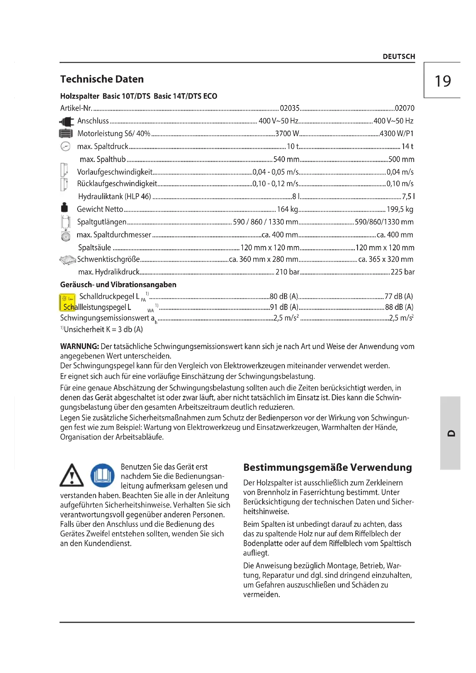 Der Holzspalter ist ausschließlich zum Zerkleinern von Brennholz in Faserrichtung bestimmt. Unter Berücksichtigung der technischen Daten und Sicherheitshinweise.