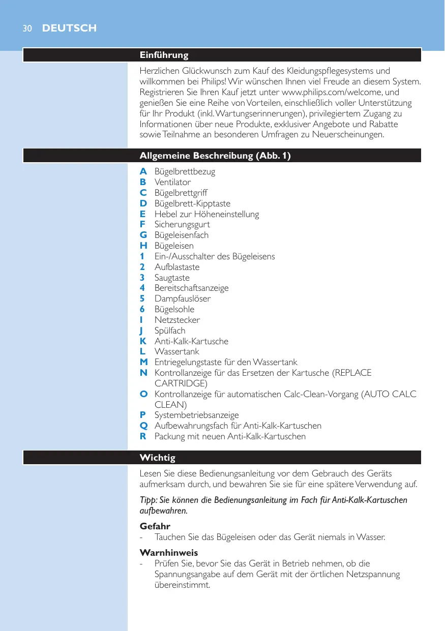 Lisez attentivement ce mode d’emploi avant d’utiliser l’appareil et conservez-le pour un usage ultérieur. Conseil :Vous pouvez loger le mode d’emploi dans le compartiment de rangement des cartouches anticalcaire. Danger -- Ne plongez jamais le fer ni l’appareil dans l’eau. Avertissement -- Avant de brancher l’appareil, vérifiez que la tension indiquée sur l’appareil correspond à la tension supportée par le secteur local. -- N’utilisez pas l’appareil si la fiche, le cordon d’alimentation, le cordon flexible ou l’appareil lui-même sont endommagés, si l’appareil est tombé ou s’il fuit.