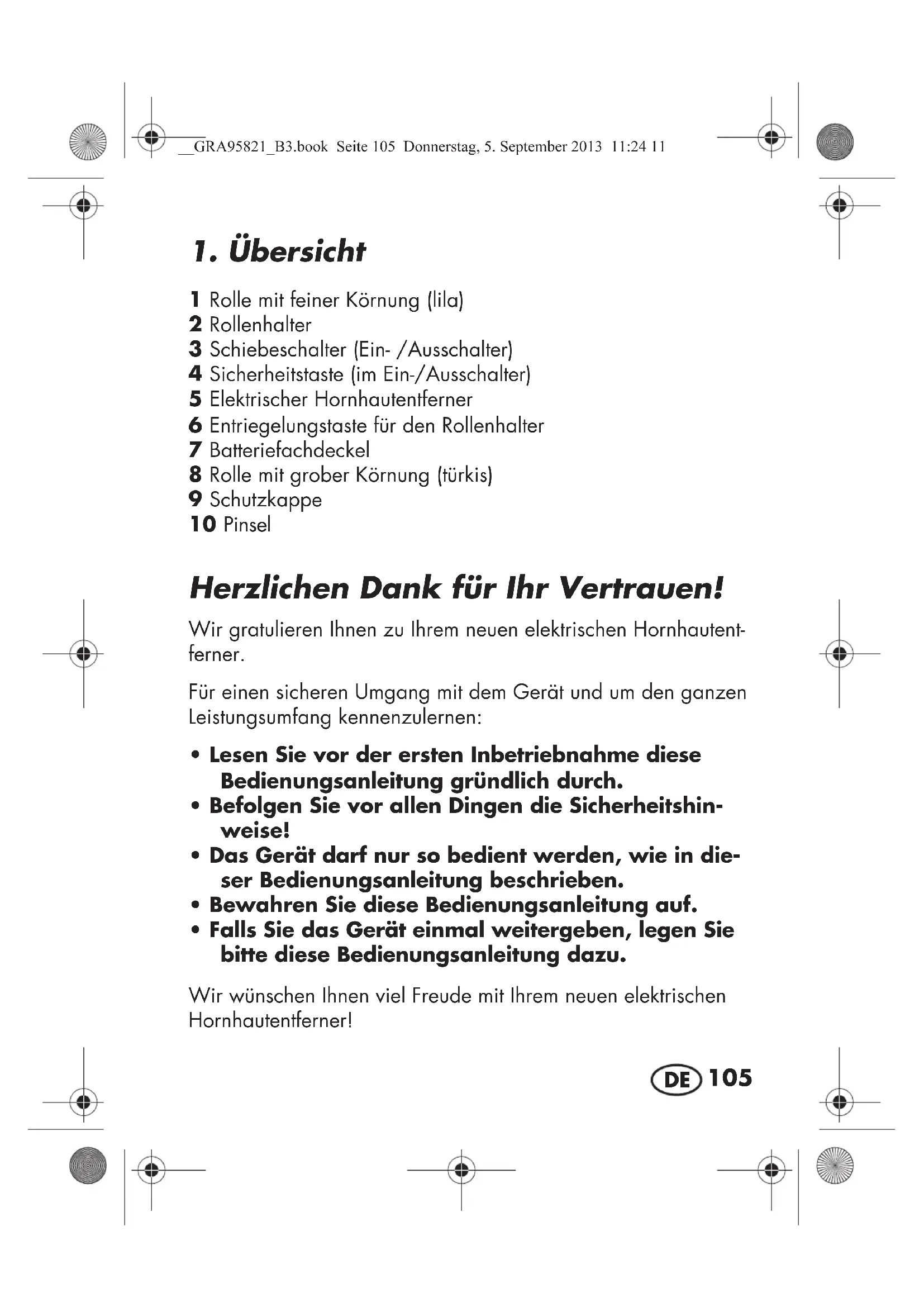 - Falls Sie das Gerät einmal weitergeben, legen Sie bitte diese Bedienungsanleitung dazu. Wir wünschen Ihnen viel Freude mit Ihrem neuen elektrischen Hornhautentferner! __GRA95821_B3.book Seite 105 Donnerstag, 5. September 2013 11:24 11106