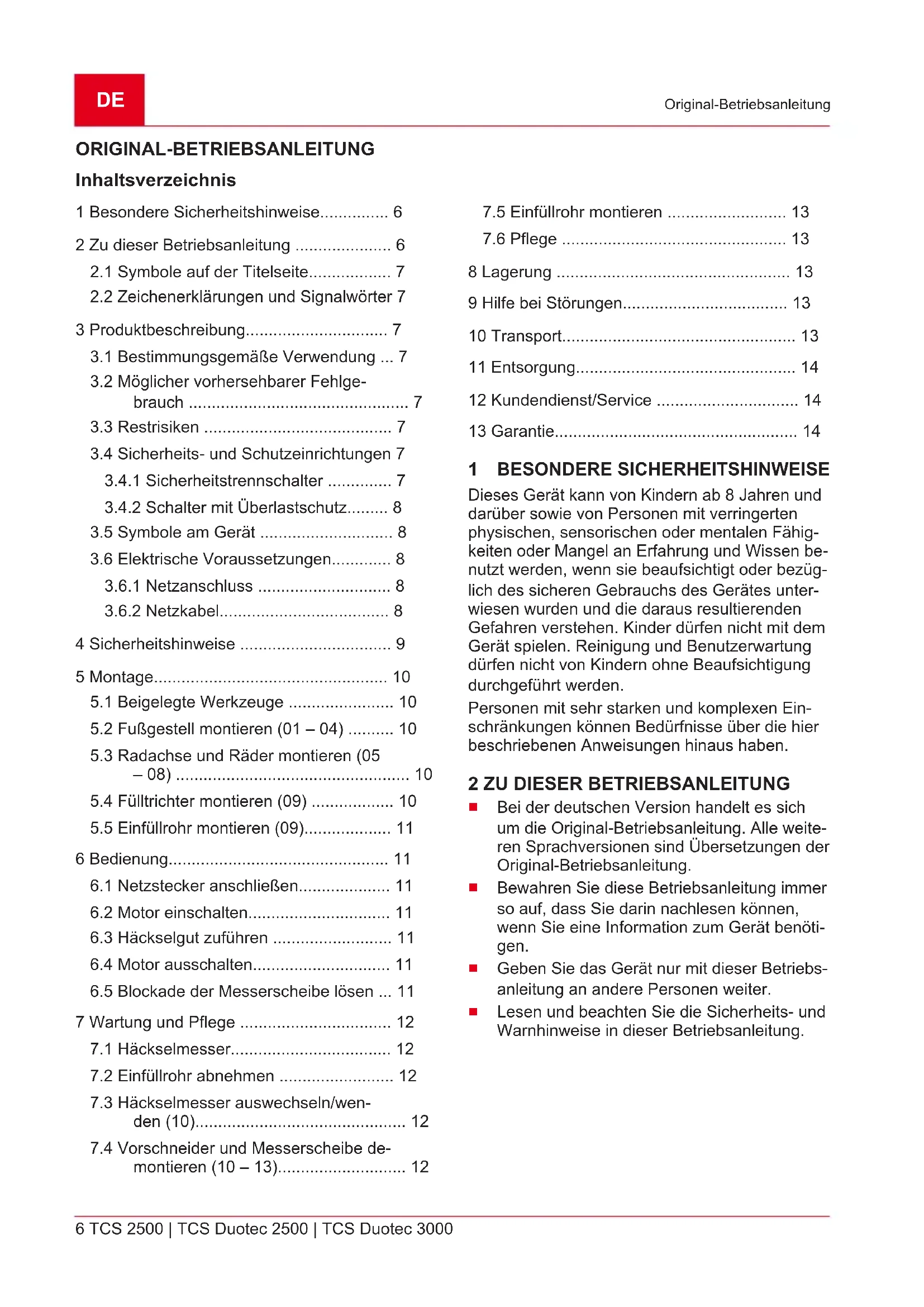 Beim Herausziehen der Sicherungsschraube (02/1) wird der Sicherheitstrennschalter ausge- löst. Der Motor kann dadurch beim Betätigen des Ein- und Ausschalters nicht mehr anlaufen.DE 8 TCS 2500 | TCS Duotec 2500 | TCS Duotec 3000 Produktbeschreibung Erst wenn das Einfüllrohr mit der originalen Si- cherungsschraube wieder auf dem Gehäuse be- festigt ist, kann durch Betätigen des Ein- und Ausschalters der Häcksler wieder in Betrieb ge- nommen werden.