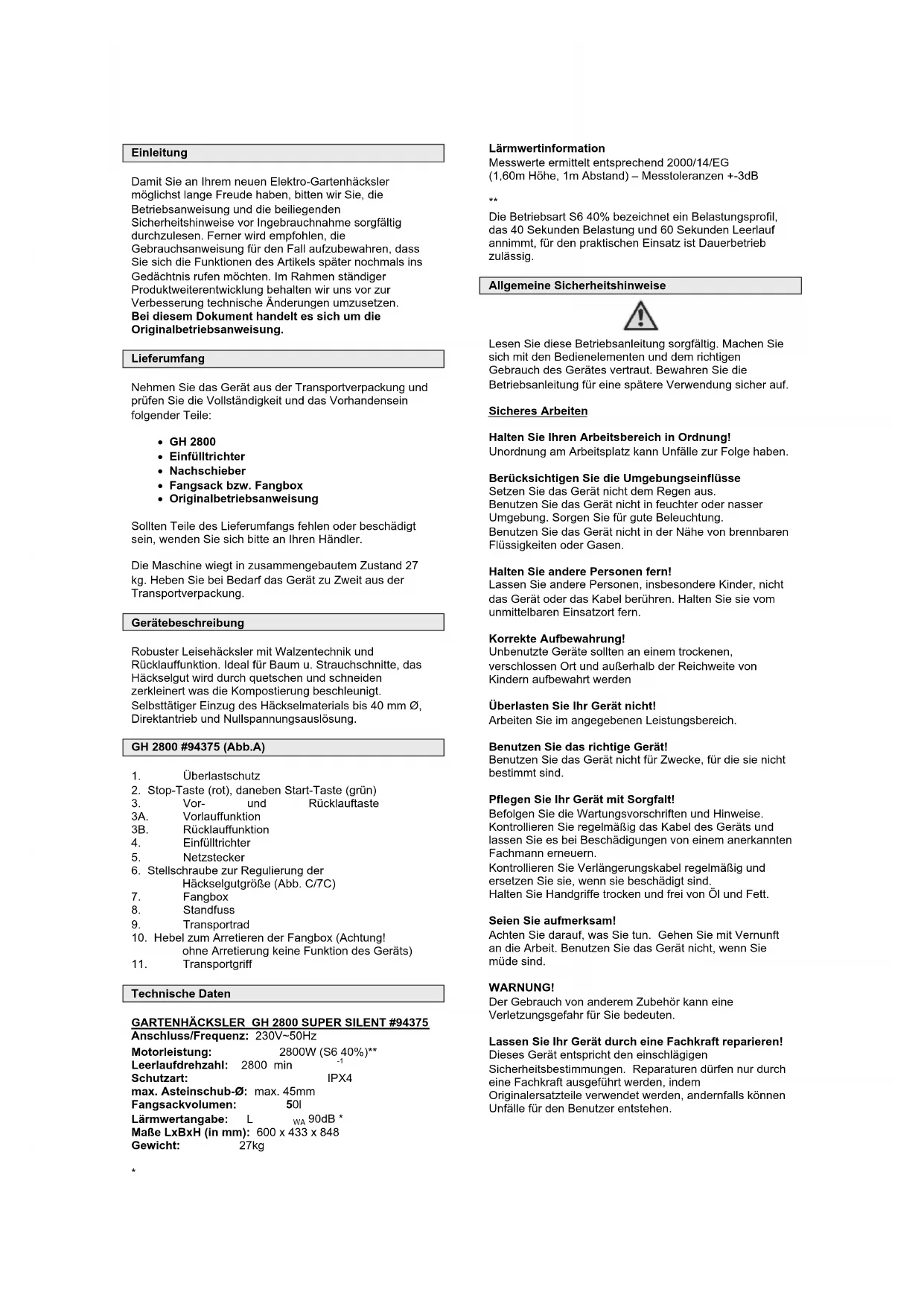 eCEinleitung Damit Sie an Ihrem neuen Elektro-Gartenhäcksler möglichst lange Freude haben, bitten wir Sie, die Betriebsanweisung und die beiliegenden Sicherheitshinweise vor Ingebrauchnahme sorgfältig durchzulesen. Ferner wird empfohlen, die Gebrauchsanweisung für den Fall aufzubewahren, dass Sie sich die Funktionen des Artikels später nochmals ins Gedächtnis rufen möchten. Im Rahmen ständiger Produktweiterentwicklung behalten wir uns vor zur Verbesserung technische Änderungen umzusetzen. Bei diesem Dokument handelt es sich um die Originalbetriebsanweisung. Lieferumfang Nehmen Sie das Gerät aus der Transportverpackung und prüfen Sie die Vollständigkeit und das Vorhandensein folgender Teile: GH 2800 Einfülltrichter Nachschieber Fangsack bzw. Fangbox Originalbetriebsanweisung Sollten Teile des Lieferumfangs fehlen oder beschädigt sein, wenden Sie sich bitte an Ihren Händler. Die Maschine wiegt in zusammengebautem Zustand 27 kg. Heben Sie bei Bedarf das Gerät zu Zweit aus der Transportverpackung. Gerätebeschreibung Robuster Leisehäcksler mit Walzentechnik und Rücklauffunktion. Ideal für Baum u. Strauchschnitte, das Häckselgut wird durch quetschen und schneiden zerkleinert was die Kompostierung beschleunigt. Selbsttätiger Einzug des Häckselmaterials bis 40 mm Ø, Direktantrieb und Nullspannungsauslösung. GH 2800 #94375 (Abb.A)