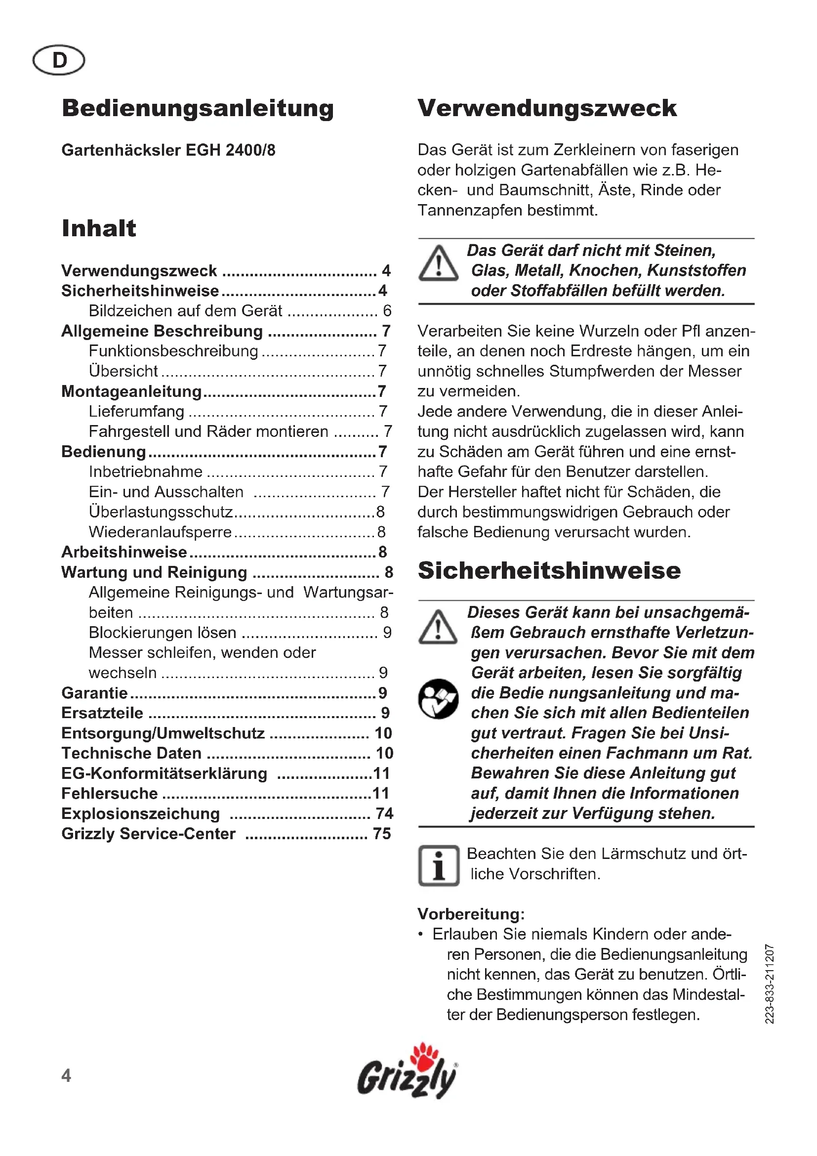 EGH 24008 - Mechanischer Häcksler Grizzly - Kostenlose Bedienungsanleitung
