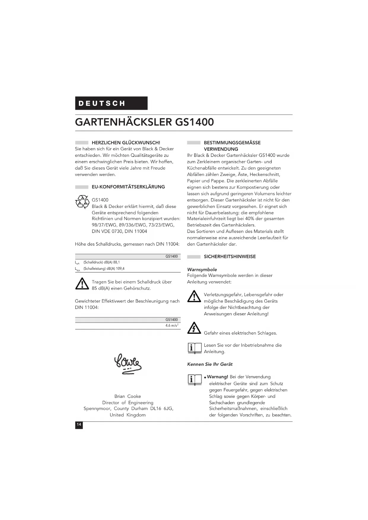 Laden Sie die Anleitung für Ihr Mechanischer Häcksler kostenlos im PDF-Format! Finden Sie Ihr Handbuch GS1400 - BLACK & DECKER und nehmen Sie Ihr elektronisches Gerät wieder in die Hand. Auf dieser Seite sind alle Dokumente veröffentlicht, die für die Verwendung Ihres Geräts notwendig sind. GS1400 von der Marke BLACK & DECKER.