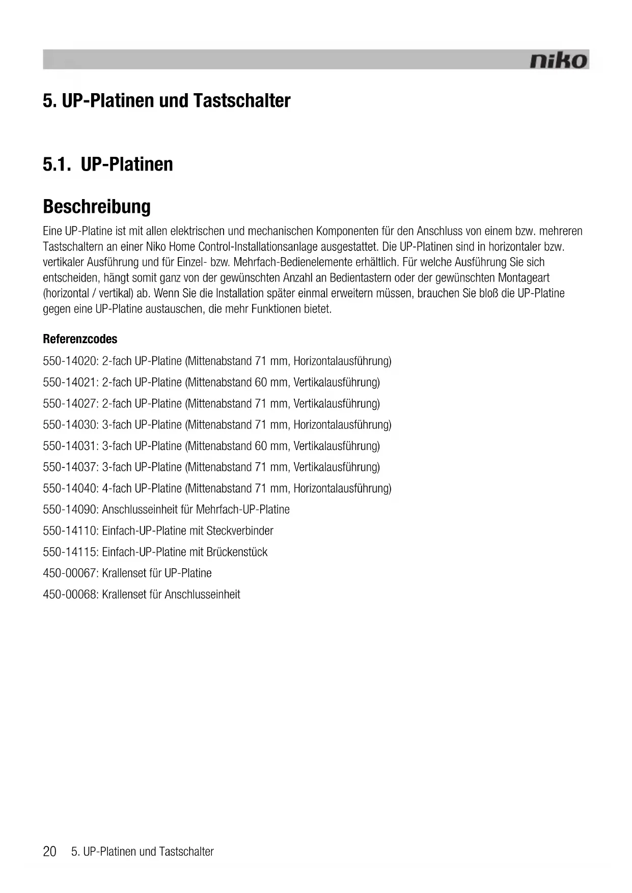 Laden Sie die Anleitung für Ihr Smart Home kostenlos im PDF-Format! Finden Sie Ihr Handbuch 55014021 - Niko und nehmen Sie Ihr elektronisches Gerät wieder in die Hand. Auf dieser Seite sind alle Dokumente veröffentlicht, die für die Verwendung Ihres Geräts notwendig sind. 55014021 von der Marke Niko.