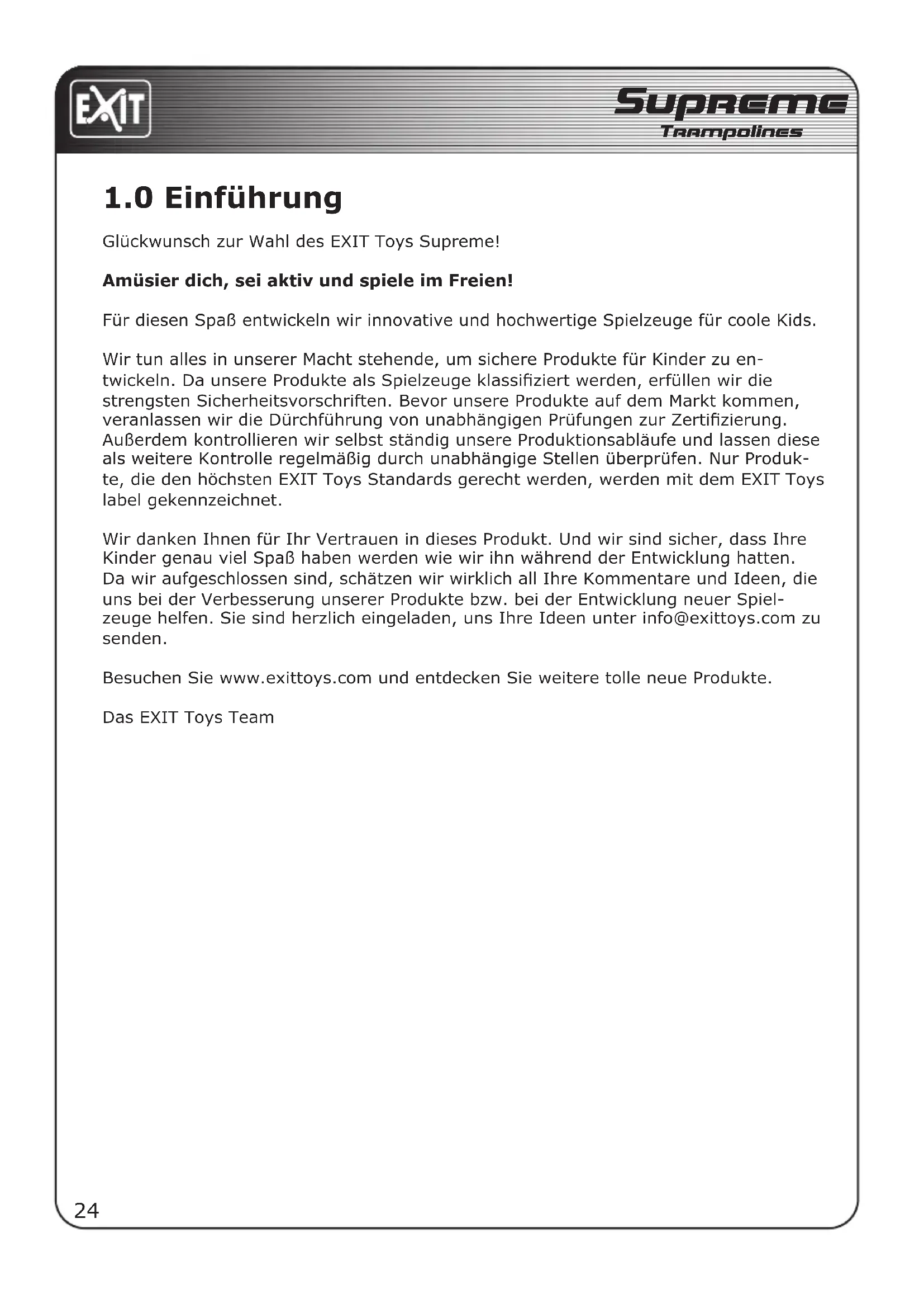 - Der Besitzer des EXIT Toys Trampolin kann nur Anspruch auf die Garantie erheben, indem er das Produkt dem EXIT Toys Handler zur Begutachtung zur Verfugung stellt. Hierzu muss dem EXIT Toys Handler der original Kaufquittung übergeben werden.