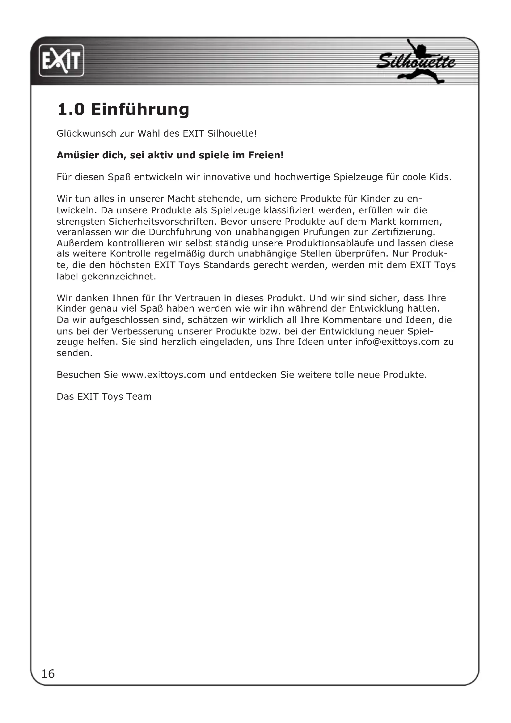 Wir danken Ihnen für Ihr Vertrauen in diesen Produkt. Und wir sind sicher, dass ihre Kinder genau viel Spaß haben werden wie wir ihn während der Entwicklung hatten. Da wir aufgeschlossen sind, schätzen wir wirklich all ihre Kommentare und Ideen, die uns bei der Verbesserung unserer Produkte bzw. bei der Entwicklung neuer Spiel-zeuge halten. Sie sind herzlich eingeladen, uns ihre Ideen unter info@exittoys.com zu senden.