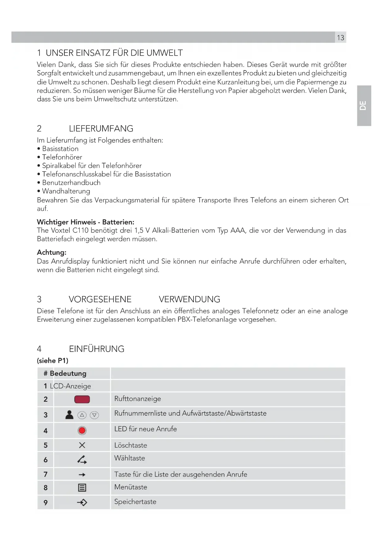 Vielen Dank, dass Sie sich für dieses Produkte entschieden haben. Dieses Gerät wurde mit größter Sorgfalt entwickelt und zusammengebaut, um Ihnen ein exzellentes Produkt zu bieten und gleichzeitig die Umwelt zu schonen. Deshalb liegt diesem Produkt eine Kurzanleitung bei, um die Papiermenge zu reduzieren. So müssen weniger Bäume für die Herstellung von Papier abgeholzt werden. Vielen Dank, dass Sie uns beim Umweltschutz unterstützen. 2 LIEFERUMFANG Im Lieferumfang ist Folgendes enthalten: tBasisstation tTelefonhörer tSpiralkabel für den Telefonhörer tTelefonanschlusskabel für die Basisstation tBenutzerhandbuch tWandhalterung Bewahren Sie das Verpackungsmaterial für spätere Transporte Ihres Telefons an einem sicheren Ort auf. Wichtiger Hinweis - Batterien: The Voxtel C110 benötigt drei 1,5 V Alkali-Batterien vom Typ AAA, die vor der Verwendung in das Batteriefach eingelegt werden müssen. Achtung: Das Anrufdisplay funktioniert nicht und Sie können nur einfache Anrufe durchführen oder erhalten, wenn die Batterien nicht eingelegt sind. 3 VORGESEHENE VERWENDUNG Diese Telefone ist für den Anschluss an ein öffentliches analoges Telefonnetz oder an eine analoge Erweiterung einer zugelassenen kompatiblen PBX-Telefonanlage vorgesehen. 4 EINFÜHRUNG (siehe P1) # Bedeutung 1 LCD-Anzeige