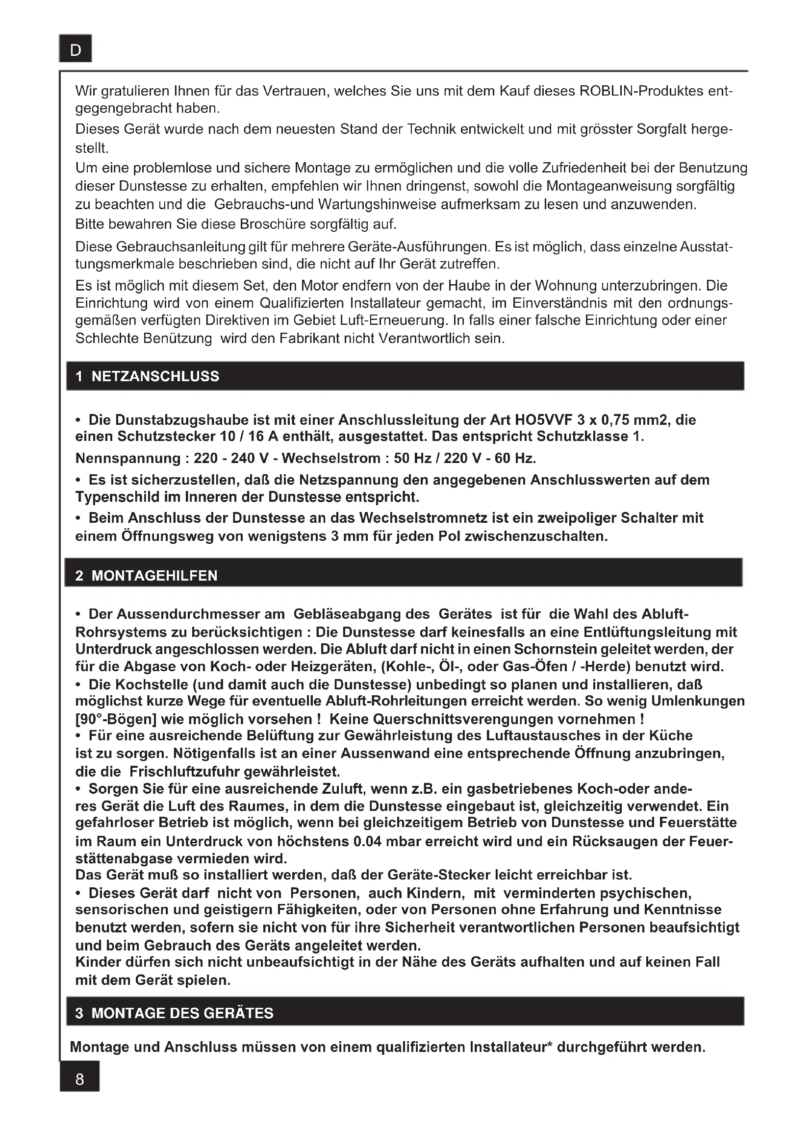 Wir gratulieren Ihnen für das Vertrauen, welches Sie uns mit dem Kauf dieses ROBLIN-Produktes ent- gegengebracht haben. Dieses Gerät wurde nach dem neuesten Stand der Technik entwickelt und mit grösster Sorgfalt herge- stellt. Um eine problemlose und sichere Montage zu ermöglichen und die volle Zufriedenheit bei der Benutzung dieser Dunstesse zu erhalten, empfehlen wir Ihnen dringenst, sowohl die Montageanweisung sorgfältig zu beachten und die Gebrauchs-und Wartungshinweise aufmerksam zu lesen und anzuwenden. Bitte bewahren Sie diese Broschüre sorgfältig auf. Diese Gebrauchsanleitung gilt für mehrere Geräte-Ausführungen. Es ist möglich, dass einzelne Ausstat- tungsmerkmale beschrieben sind, die nicht auf Ihr Gerät zutreffen. Es ist möglich mit diesem Set, den Motor endfern von der Haube in der Wohnung unterzubringen. Die Einrichtung wird von einem Qualizierten Installateur gemacht, im Einverständnis mit den ordnungs- gemäßen verfügten Direktiven im Gebiet Luft-Erneuerung. In falls einer falsche Einrichtung oder einer Schlechte Benützung wird den Fabrikant nicht Verantwortlich sein. 1 NETZANSCHLUSS