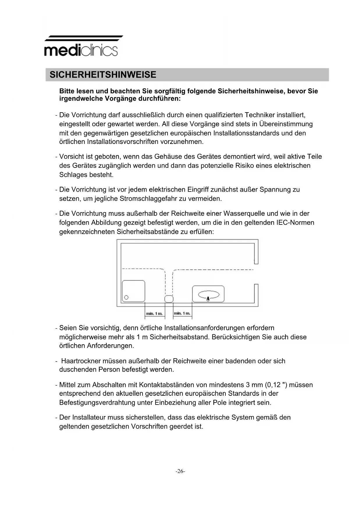 - Seien Sie vorsichtig, denn örtliche Installationsanforderungen erfordern möglicherweise mehr als 1 m Sicherheitsabstand. Berücksichtigen Sie auch diese örtlichen Anforderungen. - Haartrockner müssen außerhalb der Reichweite einer badenden oder sich duschenden Person befestigt werden. - Mittel zum Abschalten mit Kontaktabständen von mindestens 3 mm (0,12 ") müssen entsprechend den aktuellen gesetzlichen europäischen Standards in der Befestigungsverdrahtung unter Einbeziehung aller Pole integriert sein. - Der Installateur muss sicherstellen, dass das elektrische System gemäß den geltenden gesetzlichen Vorschriften geerdet ist. SICHERHEITSHINWEISEwww.mediclinics.com