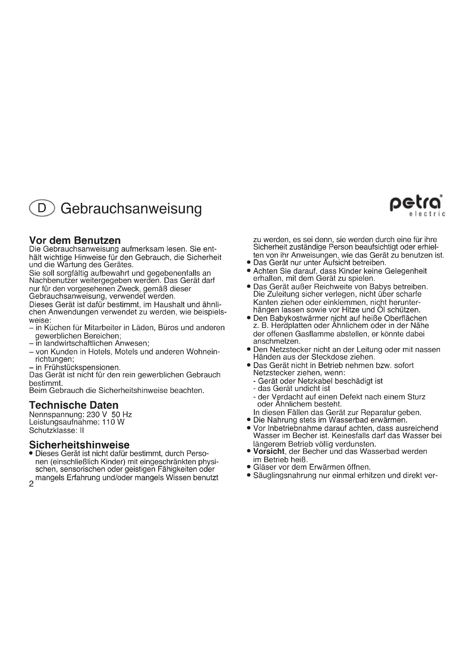 Wenn die Anschlussleitung dieses Gerätes beschädigt wird, muss sie durch den zentralen Kundendienst des Herstellers oder eine ähnlich qualifizierte Person ersetzt werden. Durch unsachgemäße Reparaturen können erhebliche Gefahren für den Benutzer entstehen. Inbetriebnahme Das Gerät kann zum bequemen Aufwärmen und Warm- halten von Babyflaschen und handelsüblichen Fertig- kostgläsern bis 73mm Durchmesser verwendet werden. Vor Inbetriebnahme die überschüssige Zuleitung am Boden des Gerätes aufwickeln und den beiliegenden Heber mit dem spitzen Ende nach unten in die Nut am oberen Rand des Gerätes einschieben. Zum Aufwärmen von Gläsern den Heber nur so weit nach unten schieben, bis der Rand des geöffneten Gla- ses gerade noch über das Gerät hinausragt. Bei Babyflaschen den Heber ganz nach unten schieben. Anschließend das Gerät bis ca. 2cm unterhalb des Ran- des mit Wasser füllen. Hinweis: Vereinzelt könnten die Gläser einiger Herstel- ler von Babynahrung beim Einsetzen in das Gerät etwas klemmen. Meist ist ein unrundes Glas die Ursache. Ver- suchen Sie, das Glas etwas zu Drehen, dann wird es in der Regel leicht hineinpassen. Temperatureinstellung Am Drehknopf wird die Temperatur des Wasserbades ein- gestellt. Die Erwärmung der Babynahrung ist von deren Konsistenz und der Beschaffenheit der Flasche bzw. des Glases abhängig. Für festere Kost eine höhere Einstellung des Drehknopfes wählen als für flüssige Nahrung. Ebenso verlangen volle Flaschen oder Gläser eine etwas höhere Einstellung als weniger gefüllte. Die jeweils richtige Einstellung wird in der Praxis schnell ermittelt. Die Kontrollleuchte zeigt an, dass das Gerät heizt. Sie erlischt, wenn das Wasserbad die eingestellte Temperatur erreicht hat. Zum Herausnehmen des Glases den Heber etwas nach oben ziehen. Die Flasche gut schütteln bzw. die Fertigkost gut umrühren, damit der Inhalt gleichmäßig warm ist. Die richtige Temperatur sollte stets durch Anlegen an die Wange, besser noch durch eigenes Probieren geprüft werden. Soll die Nahrung für einige Zeit warmgehalten werden, das4 Fläschchen oder Glas im Gerät stehen lassen. Der Ther- mostat sorgt für konstante Temperatur, indem er die Hei- zung von Zeit zu Zeit automatisch einschaltet. Reinigung und Pflege Vor jeder Reinigung den Netzstecker ziehen und das Was- ser ausgießen. Das Gerät nicht in Wasser tauchen. Keine Scheuermittel verwenden. Das Gerät nur mit einem feuch- ten Tuch abwischen, bei Bedarf mit etwas Spülmittel. Garantie-Information Für unsere Geräte übernehmen wir gegenüber dem Endkunden eine 24-monatige Haltbarkeitsgarantie. Sie beginnt mit dem Kauf des Gerätes durch den Endkun- den und gilt im Gebiet der Bundesrepublik Deutschland. Ansprüche aus dieser Garantie sind unter Vorlage des Kaufbelegs direkt gegenüber unserem zentralen Kun- dendienst geltend zu machen. Von der Garantie ausgeschlossen sind Schäden durch normalen Verschleiß, unsachgemäßen Gebrauch sowie unterbliebene Pflege. Der Endkunde besitzt zusätzlich zu den Ansprüchen aus dieser Garantie gesetzliche Ansprüche wegen Mängeln des Gerätes gegenüber seinem direkten Verkäufer/Händler, die durch diese Garantie nicht eingeschränkt werden. petra - electric Kundendienst Greisbacherstraße 6 D-89331 Burgau www.petra-electric.de Das Gerät entspricht den Europäischen Richtlinien 2006/95/EG, 2004/108/EG und 2005/32/EG. Dieses Produkt darf am Ende seiner Lebensdauer nicht über den normalen Haushaltsabfall entsorgt werden, sondern muss an einem Sammelpunkt für das Recycling von elektrischen und elektroni- schen Geräten abgegeben werden. Die Werkstoffe sind gemäß ihrer Kennzeichnung wieder- verwertbar. Mit der Wiederverwendung, der stofflichen Verwertung oder anderen Formen der Verwertung von Altgeräten leisten Sie einen wichtigen Beitrag zum Schutze unserer Umwelt. Bitte erfragen Sie bei der Gemeindeverwaltung die zuständige Entsorgungsstelle. Änderungen vorbehalten CE5 Before Using Read these instructions carefully. They contain important notes for the use, safety and maintenance of the appliance. Keep them in a safe place and transfer them to a possible succeeding user. Only use the appliance for the purpose mentioned in these instructions. This appliance is intended for domestic use and similar applications, such as: - in staff kitchens in shops, offices and other commercial esta- blishments; - in agricultural establishments; - by guests in hotels, motels and other accommodation facilities; - in bed-and-breakfast facilities. The appliance is not intended for purely commercial use. Be sure to follow the safety information when using the appliance. Technical Data Rated voltage: 230 V 50 Hz Power consumption: 110 watts Protection class: II Safety Advice