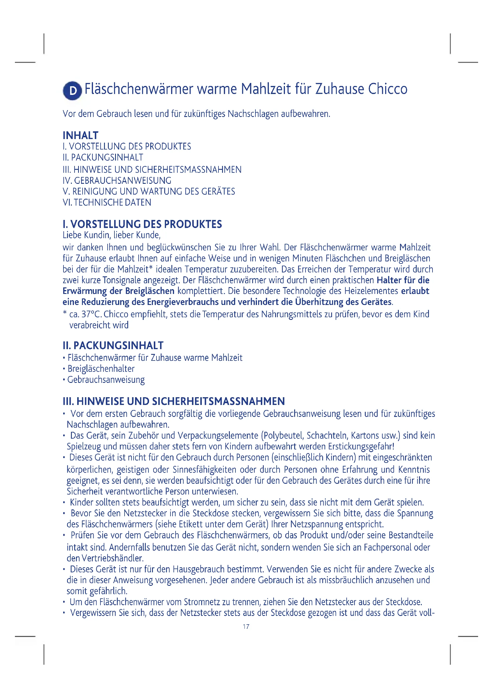Liebe Kundin, lieber Kunde, wir danken Ihnen und beglückwünschen Sie zu Ihrer Wahl. Der Fläschchenwärmer warme Mahlzeit für Zuhause erlaubt Ihnen auf einfache Weise und in wenigen Minuten Fläschchen und Breigläschen bei der für die Mahlzeit* idealen Temperatur zuzubereiten. Das Erreichen der Temperatur wird durch zwei kurze Tonsignale angezeigt. Der Fläschchenwärmer wird durch einen praktischen Halter für die Erwärmung der Breigläschen komplettiert. Die besondere Technologie des Heizelementes erlaubt eine Reduzierung des Energieverbrauchs und verhindert die Überhitzung des Gerätes.