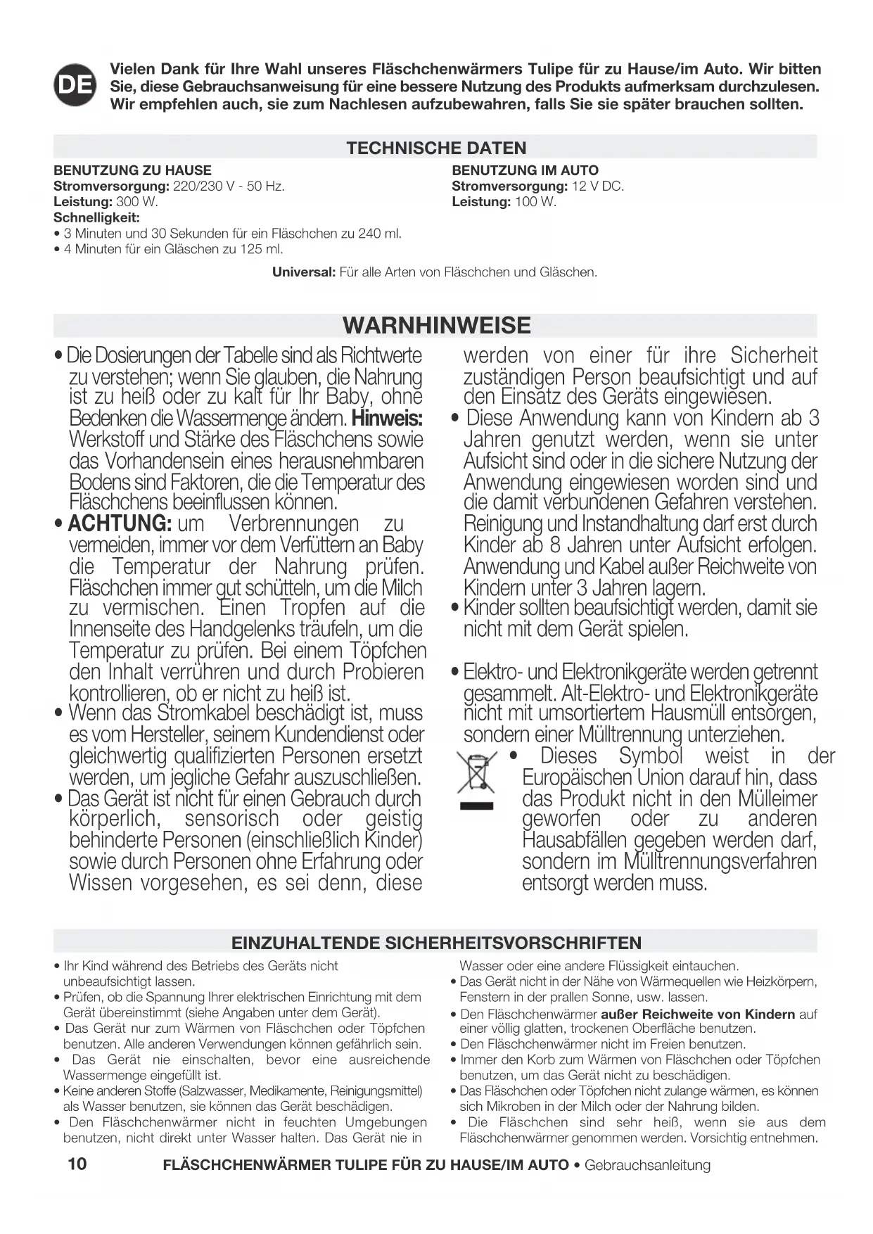- Dieses Symbol weist in der Europäischen Union darauf hin, dass das Produkt nicht in den Mülleimer geworfen oder zu anderen Hausabfällen gegeben werden darf, sondern im Mülltrennungsverfahren entsorgt werden muss. BENUTZUNG ZU HAUSEStromversorgung: 220/230 V - 50 Hz.Leistung: 300 W.Schnelligkeit:• 3 Minuten und 30 Sekunden für ein Fläschchen zu 240 ml.• 4 Minuten für ein Gläschen zu 125 ml.BENUTZUNG IM AUTOStromversorgung: 12 V DC.Leistung: 100 W.Universal: Für alle Arten von Fläschchen und Gläschen. TECHNISCHE DATEN• Das Gerät während des Betriebs oder wenn es heißes Wasser enthält nicht transportieren.
