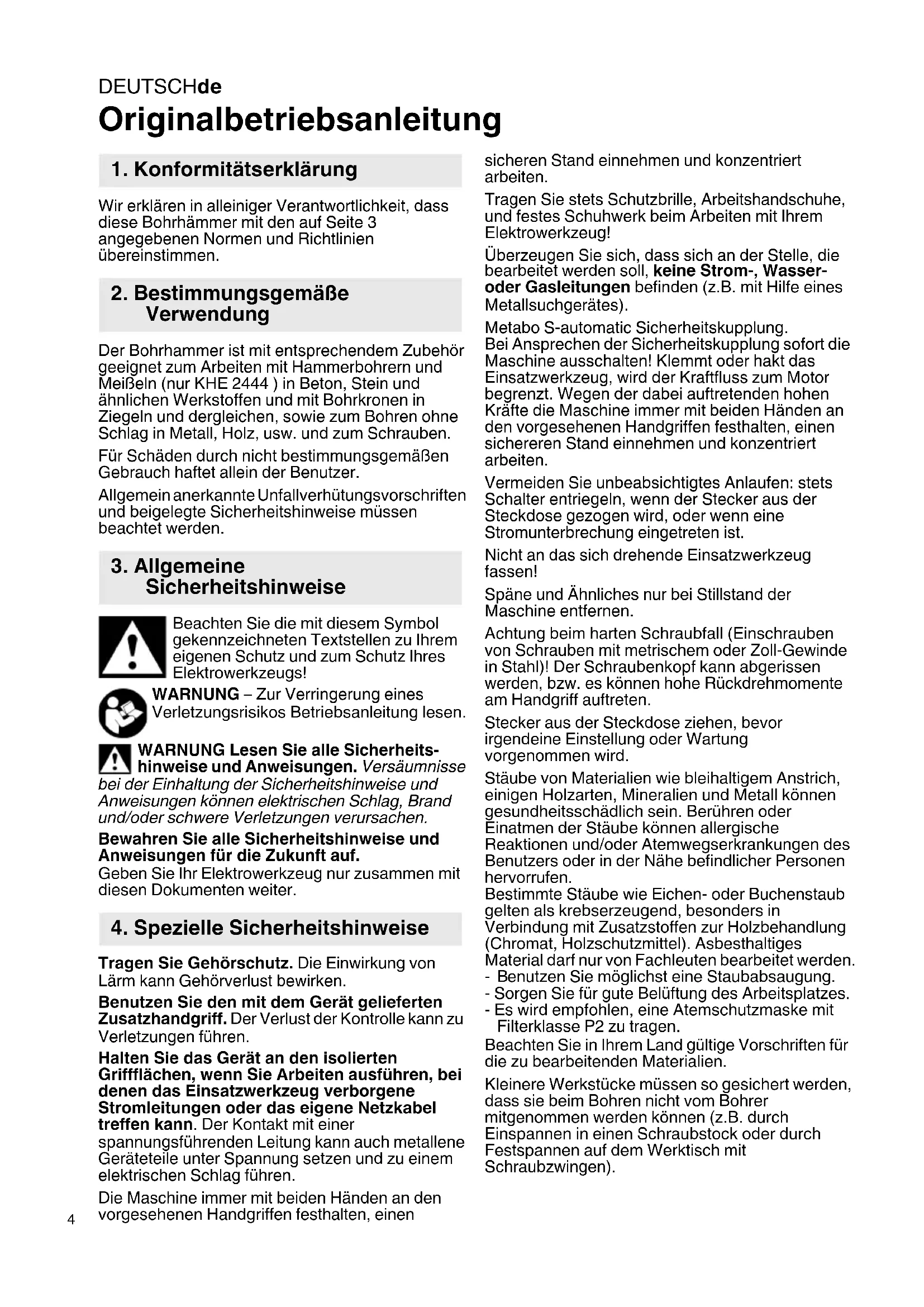 Originalbetriebsanleitung Wir erklären in alleiniger Verantwortlichkeit, dass diese Bohrhämmer mit den auf Seite 3 angegebenen Normen und Richtlinien übereinstimmen. Der Bohrhammer ist mit entsprechendem Zubehör geeignet zum Arbeiten mit Hammerbohrern und Meißeln (nur KHE 2444 ) in Beton, Stein und ähnlichen Werkstoffen und mit Bohrkronen in Ziegeln und dergleichen, sowie zum Bohren ohne Schlag in Metall, Holz, usw. und zum Schrauben. Für Schäden durch nicht bestimmungsgemäßen Gebrauch haftet allein der Benutzer. Allgemein anerkannte Unfallverhütungsvorschriften und beigelegte Sicherheitshinweise müssen beachtet werden. Beachten Sie die mit diesem Symbol gekennzeichneten Textstellen zu Ihrem eigenen Schutz und zum Schutz Ihres Elektrowerkzeugs! WARNUNG – Zur Verringerung eines Verletzungsrisikos Betriebsanleitung lesen. WARNUNG Lesen Sie alle Sicherheits- hinweise und Anweisungen. Versäumnisse bei der Einhaltung der Sicherheitshinweise und Anweisungen können elektrischen Schlag, Brand und/oder schwere Verletzungen verursachen. Bewahren Sie alle Sicherheitshinweise und Anweisungen für die Zukunft auf. Geben Sie Ihr Elektrowerkzeug nur zusammen mit diesen Dokumenten weiter. Tragen Sie Gehörschutz. Die Einwirkung von Lärm kann Gehörverlust bewirken. Benutzen Sie den mit dem Gerät gelieferten Zusatzhandgriff. Der Verlust der Kontrolle kann zu Verletzungen führen. Halten Sie das Gerät an den isolierten Griffflächen, wenn Sie Arbeiten ausführen, bei denen das Einsatzwerkzeug verborgene Stromleitungen oder das eigene Netzkabel treffen kann. Der Kontakt mit einer spannungsführenden Leitung kann auch metallene Geräteteile unter Spannung setzen und zu einem elektrischen Schlag führen. Die Maschine immer mit beiden Händen an den vorgesehenen Handgriffen festhalten, einen sicheren Stand einnehmen und konzentriert arbeiten. Tragen Sie stets Schutzbrille, Arbeitshandschuhe, und festes Schuhwerk beim Arbeiten mit Ihrem Elektrowerkzeug! Überzeugen Sie sich, dass sich an der Stelle, die bearbeitet werden soll, keine Strom-, Wasser- oder Gasleitungen befinden (z.B. mit Hilfe eines Metallsuchgerätes). Metabo S-automatic Sicherheitskupplung. Bei Ansprechen der Sicherheitskupplung sofort die Maschine ausschalten! Klemmt oder hakt das Einsatzwerkzeug, wird der Kraftfluss zum Motor begrenzt. Wegen der dabei auftretenden hohen Kräfte die Maschine immer mit beiden Händen an den vorgesehenen Handgriffen festhalten, einen sichereren Stand einnehmen und konzentriert arbeiten. Vermeiden Sie unbeabsichtigtes Anlaufen: stets Schalter entriegeln, wenn der Stecker aus der Steckdose gezogen wird, oder wenn eine Stromunterbrechung eingetreten ist. Nicht an das sich drehende Einsatzwerkzeug fassen! Späne und Ähnliches nur bei Stillstand der Maschine entfernen. Achtung beim harten Schraubfall (Einschrauben von Schrauben mit metrischem oder Zoll-Gewinde in Stahl)! Der Schraubenkopf kann abgerissen werden, bzw. es können hohe Rückdrehmomente am Handgriff auftreten. Stecker aus der Steckdose ziehen, bevor irgendeine Einstellung oder Wartung vorgenommen wird. Stäube von Materialien wie bleihaltigem Anstrich, einigen Holzarten, Mineralien und Metall können gesundheitsschädlich sein. Berühren oder Einatmen der Stäube können allergische Reaktionen und/oder Atemwegserkrankungen des Benutzers oder in der Nähe befindlicher Personen hervorrufen. Bestimmte Stäube wie Eichen- oder Buchenstaub gelten als krebserzeugend, besonders in Verbindung mit Zusatzstoffen zur Holzbehandlung (Chromat, Holzschutzmittel). Asbesthaltiges Material darf nur von Fachleuten bearbeitet werden.