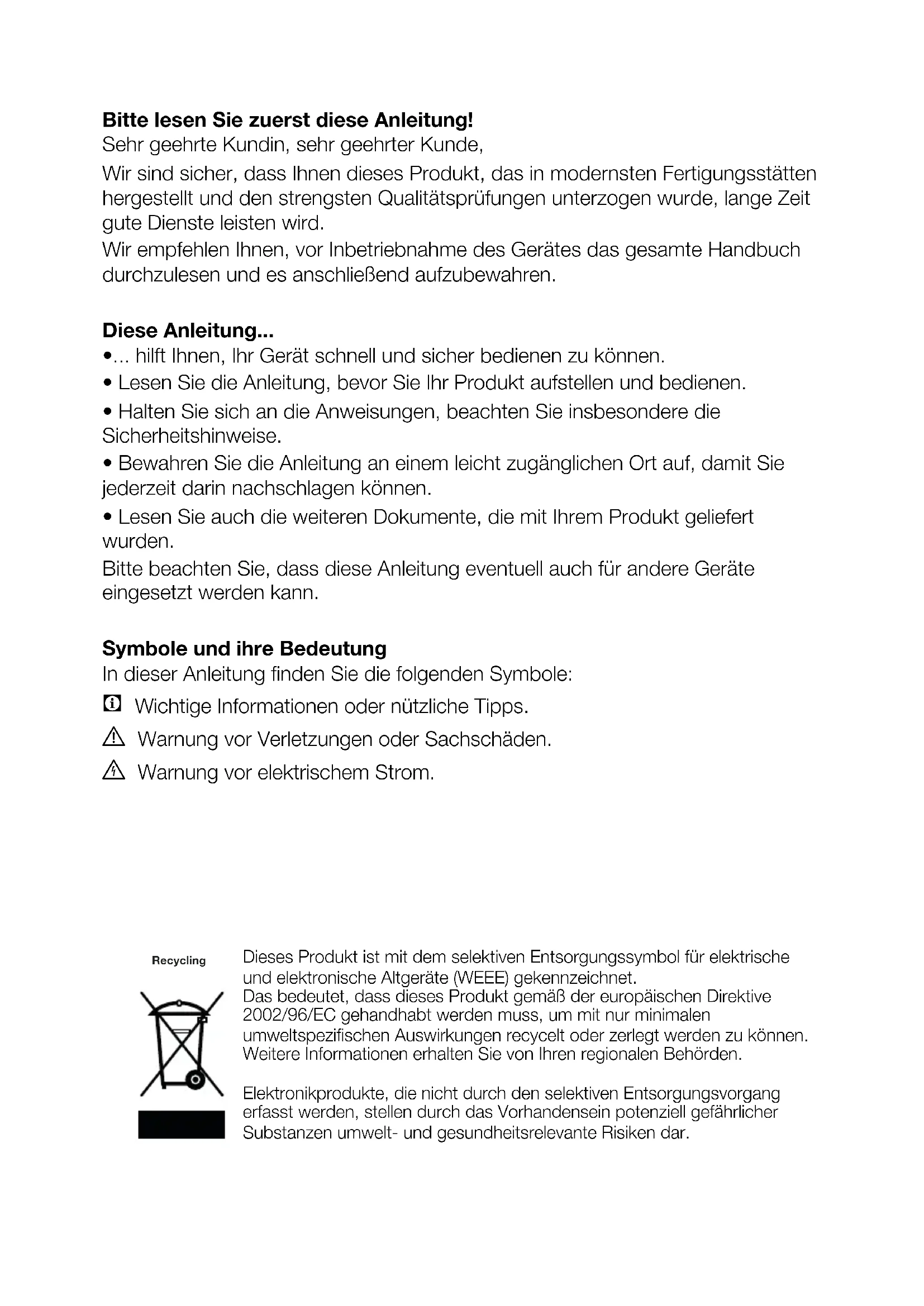 - Lesen Sie auch die weiteren Dokumente, die mit Ihrem Produkt geliefert wurden. Bitte beachten Sie, dass diese Anleitung eventuell auch für andere Geräte eingesetzt werden kann. Symbole und ihre Bedeutung In dieser Anleitung finden Sie die folgenden Symbole: C Wichtige Informationen oder nützliche Tipps. A Warnung vor Verletzungen oder Sachschäden. B Warnung vor elektrischem Strom. Dieses Produkt ist mit dem selektiven Entsorgungssymbol für elektrische und elektronische Altgeräte (WEEE) gekennzeichnet. Das bedeutet, dass dieses Produkt gemäß der europäischen Direktive 2002/96/EC gehandhabt werden muss, um mit nur minimalen umweltspezifischen Auswirkungen recycelt oder zerlegt werden zu können. Weitere Informationen erhalten Sie von Ihren regionalen Behörden. Elektronikprodukte, die nicht durch den selektiven Entsorgungsvorgang erfasst werden, stellen durch das Vorhandensein potenziell gefährlicher Substanzen umwelt- und gesundheitsrelevante Risiken dar. RecyclingDE