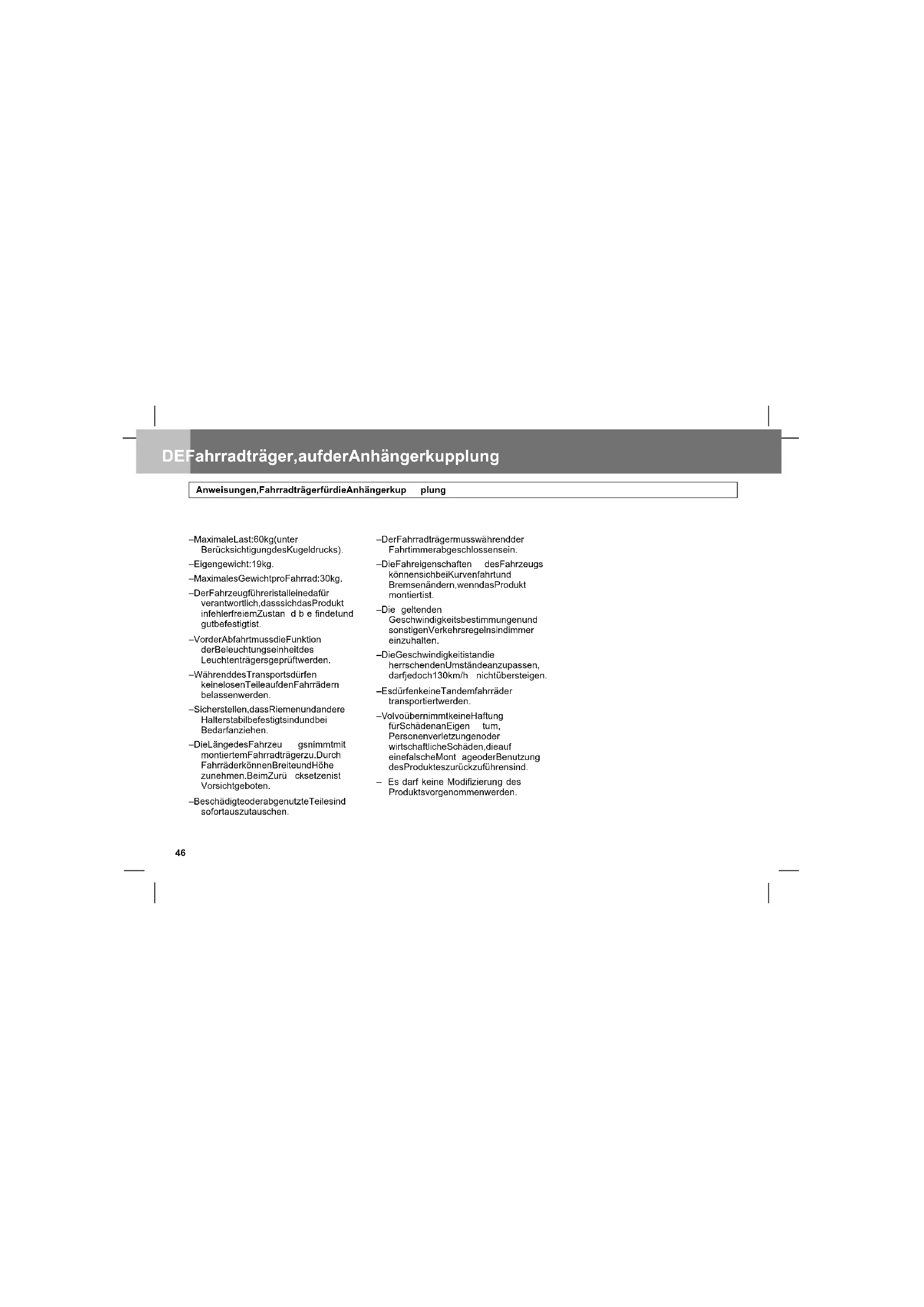 Transport .................................................................. 51 Justieren .................................................................. 54 Rampe .................................................................... 57DE Fahrradträger, auf der Anhängerkupplung Anweisungen, Fahrradträger für die Anhängerkup plung – Maximale L ast: 60 kg (unter Berücksichtigung des Kugeldrucks). – Eigengewich t: 1 9 kg. – Maximales Gewicht pro Fahrrad: 30 kg. – Der Fahrzeugführer ist alleine dafür verantwortlich, dass sich das Produkt in fehlerfreiem Zustan dbefindet und gut befestigt ist. – Vor der Abfahrt muss die Funktion der Beleuchtungseinheit des Leuchtenträgers geprüft werden. – Während de s Transports dürfen keine losen Teile auf den Fahrrädern belassen werden. – Sicherstellen, dass Riemen und andere Halter stabil befestigt sind und bei Bedarf anziehen. – Die Länge des Fahrzeu gs nimmt mit montiertem Fahrradträger zu. Durch Fahrräder können Breite und Höhe zunehmen. Beim Zurü cksetzen ist Vorsicht gebote n. – Beschädigte oder abgenutzte Teile sind sofort auszutauschen. – Der F ah rradträger muss während d er Fahrt immer abgeschlossen sein. – Die Fahreigenschaften des Fahrzeugs können sich bei Kurvenfahrt und Bremsen ändern, wenn das Produkt montiert ist. – Die geltenden Geschwindigkeitsbestimmungen und sonstigen Verke hrsregeln sin d immer einzuhalten. – Die Geschwindigkei t ist an die herrschenden Umstände anzupa ssen, darf jedoch 130 km/h nicht übersteigen. – Es d ürfen keine Tandemfahrräder transportiert werden. – Volvo übernimmt keine H aftung für Schäden an Eigen tum, Personenverletzunge n o der wirtschaftliche Schäden, die au f eine falsche Mont age oder Benutzung des Produktes zurückzuführen sind. – Es darf keine Mo difizi erung des Produkts vorgenommen werden. 46Fahrradträger, auf der Anhängerkupplung DE Vorbereitungen