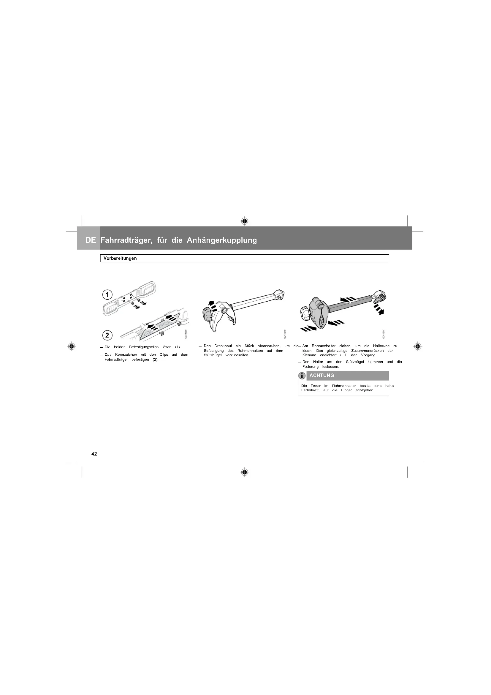 Den Halter um den Stützbügel klemmen und die Federung loslassen. ACHTUNG Die Feder im Rahmenhalter besitzt eine hohe Federkraft, auf die Finger achtgeben. DE Fahrradträger, für die Anhängerkupplung Vorbereitungen