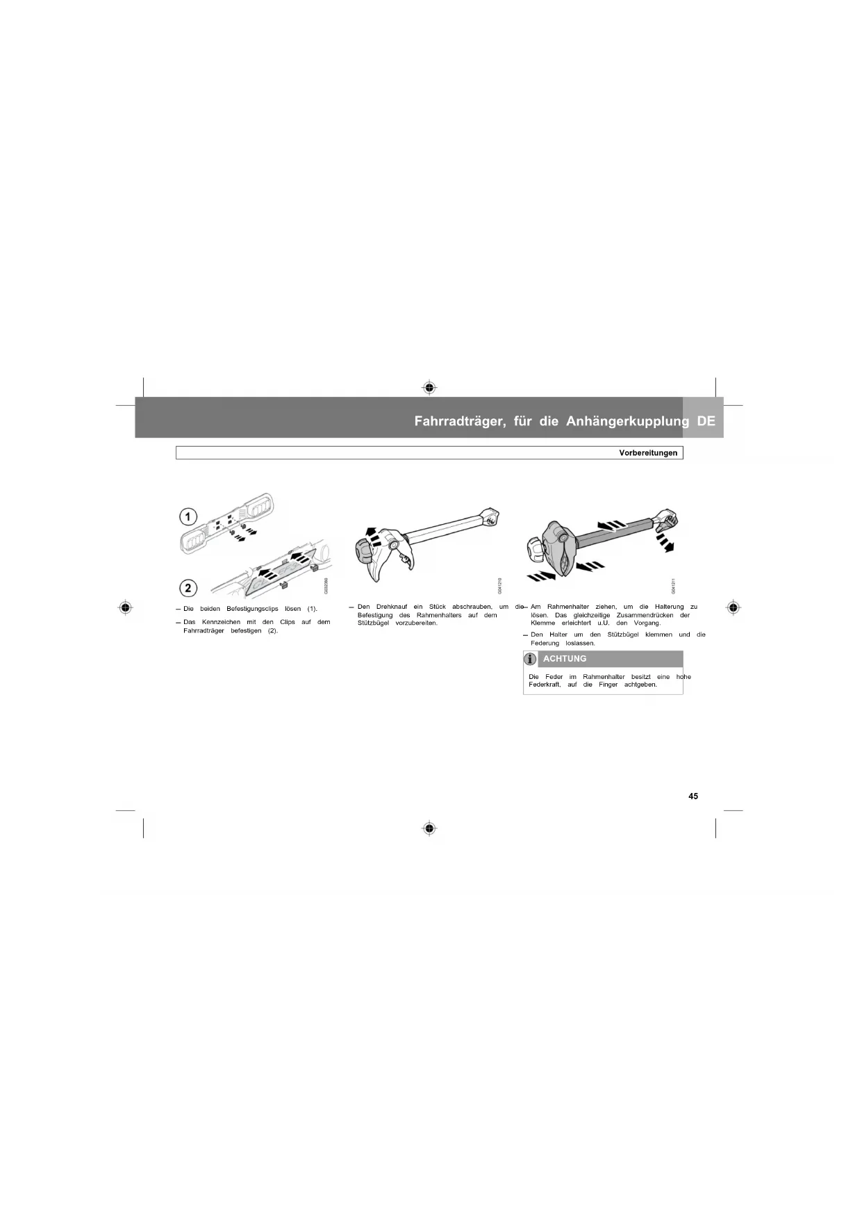 Den Halter um den Stützbügel klemmen und die Federung loslassen. ACHTUNG Die Feder im Rahmenhalter besitzt eine hohe Federkraft, auf die Finger achtgeben. Fahrradträger, für die Anhängerkupplung DE Vorbereitungen