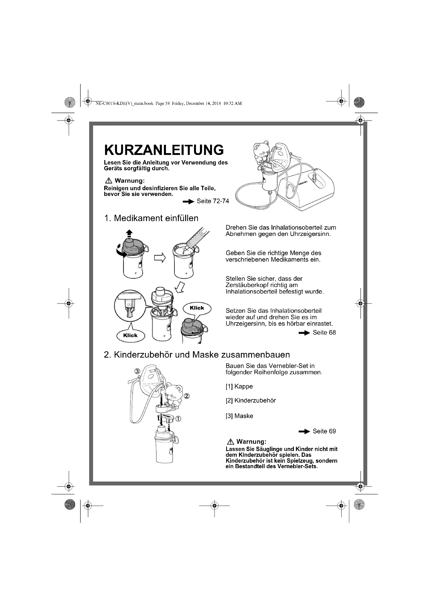 NE-C801S-KDE(V)_main.book Page 57 Friday, December 14, 2018 10:32 AMKURZANLEITUNG Lesen Sie die Anleitung vor Verwendung des Geräts sorgfältig durch. Warnung: Reinigen und desinfizieren Sie alle Teile, bevor Sie sie verwenden. Seite 72-74