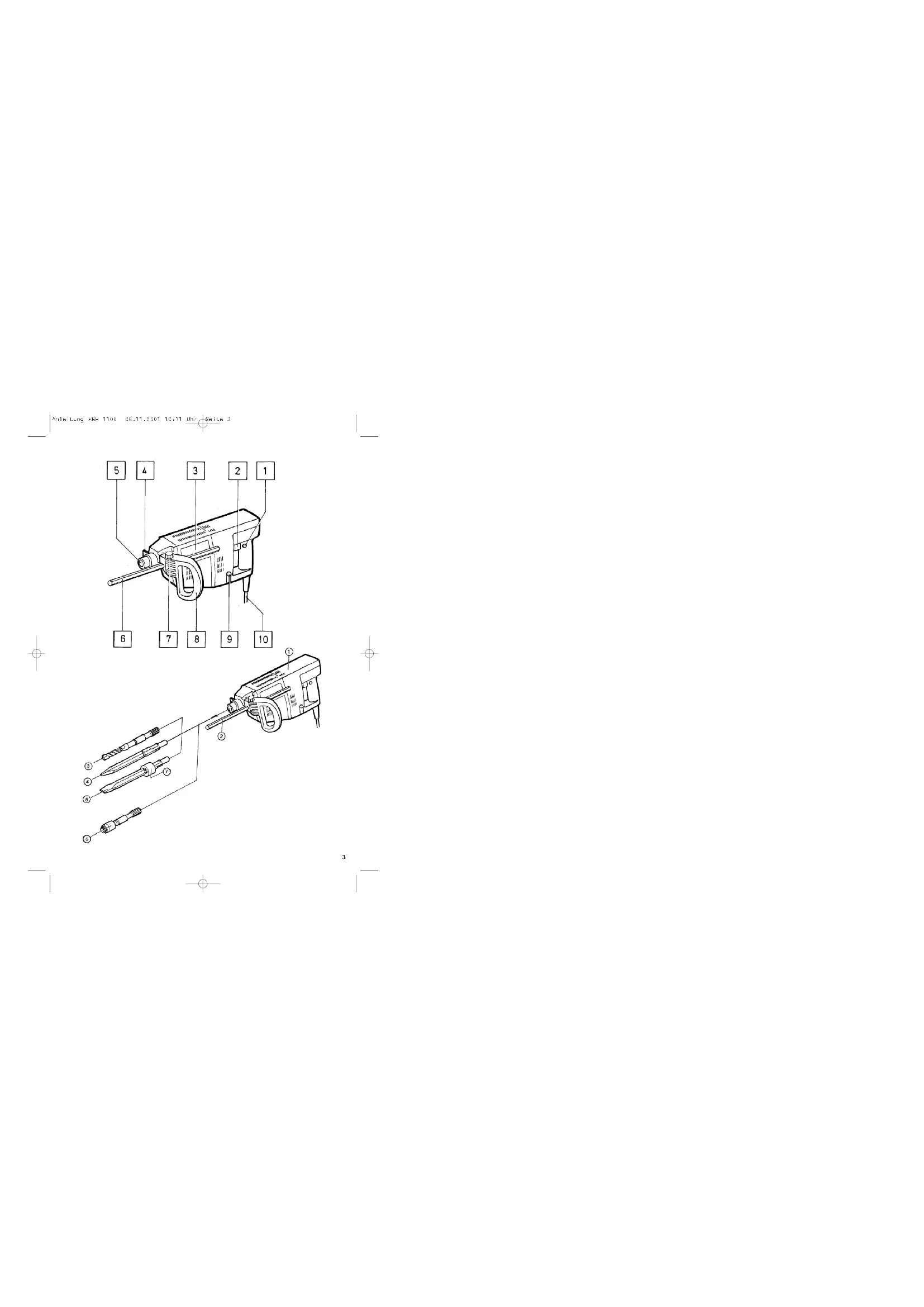 Benennung 1 Feststellknopf 2 Betriebsschalter 3 Typenschild 4 Arretierungshebel 5 Werkzeugaufnahme 6 Tiefenanschlag 7 Feststellschraube 8 Handgriff 9 Stellknopf 10 Netzleitung Zubehör 1 EBH 1100 2 Tiefenanschlag 3 Steinbohrer Ø 25 4 Spitzmeißel 5 Flachmeißel 6 SDS-Plus-Adapter 7 Staubkappe Technische Daten Einzelschlagstärke: 4,3 J (Joule) Werkzeugaufnahme: Große Keilwelle Gewicht: 5,9 kg Schalldruckpegel LPA: 98 dB(A) Schalleistungspegel LWA: 108,6 dB(A) Vibration: a