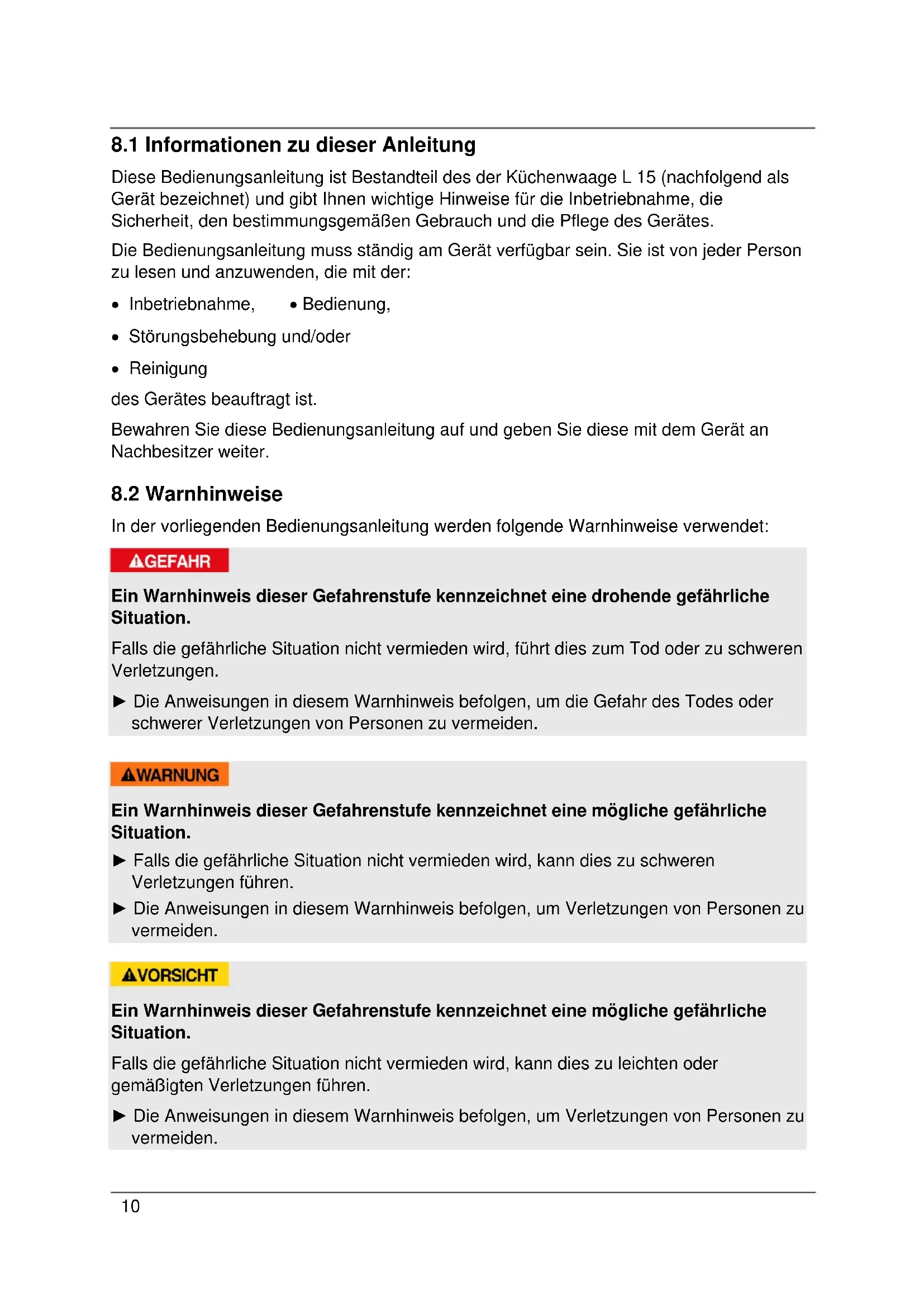 Diese Bedienungsanleitung ist Bestandteil des der Küchenwaage L 15 (nachfolgend als Gerät bezeichnet) und gibt Ihnen wichtige Hinweise für die Inbetriebnahme, die Sicherheit, den bestimmungsgemäßen Gebrauch und die Pflege des Gerätes. Die Bedienungsanleitung muss ständig am Gerät verfügbar sein. Sie ist von jeder Person zu lesen und anzuwenden, die mit der: Inbetriebnahme, Bedienung, Störungsbehebung und/oder Reinigung des Gerätes beauftragt ist. Bewahren Sie diese Bedienungsanleitung auf und geben Sie diese mit dem Gerät an Nachbesitzer weiter.