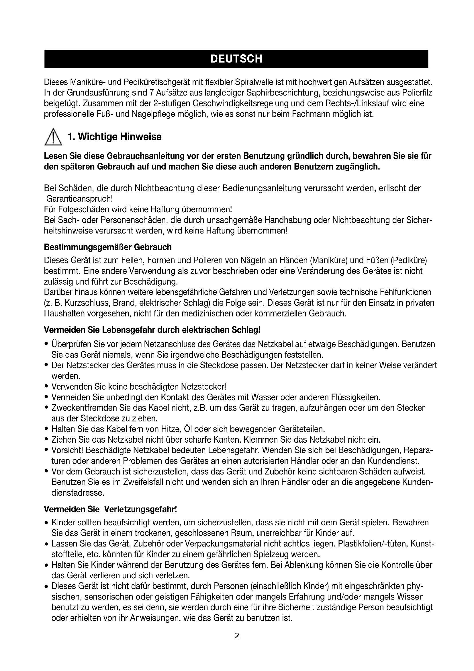 Lesen Sie diese Gebrauchsanleitung vor der ersten Benutzung gründlich durch, bewahren Sie sie für den späteren Gebrauch auf und machen Sie diese auch anderen Benutzern zugänglich. Bei Schäden, die durch Nichtbeachtung dieser Bedienungsanleitung verursacht werden, erlischt der Garantieanspruch! Für Folgeschäden wird keine Haftung übernommen! Bei Sach- oder Personenschäden, die durch unsachgemäße Handhabung oder Nichtbeachtung der Sicher- heitshinweise verursacht werden, wird keine Haftung übernommen! Bestimmungsgemäßer Gebrauch Dieses Gerät ist zum Feilen, Formen und Polieren von Nägeln an Händen (Maniküre) und Füßen (Pediküre) bestimmt. Eine andere Verwendung als zuvor beschrieben oder eine Veränderung des Gerätes ist nicht zulässig und führt zur Beschädigung. Darüber hinaus können weitere lebensgefährliche Gefahren und Verletzungen sowie technische Fehlfunktionen (z. B. Kurzschluss, Brand, elektrischer Schlag) die Folge sein. Dieses Gerät ist nur für den Einsatz in privaten Haushalten vorgesehen, nicht für den medizinischen oder kommerziellen Gebrauch. Vermeiden Sie Lebensgefahr durch elektrischen Schlag!