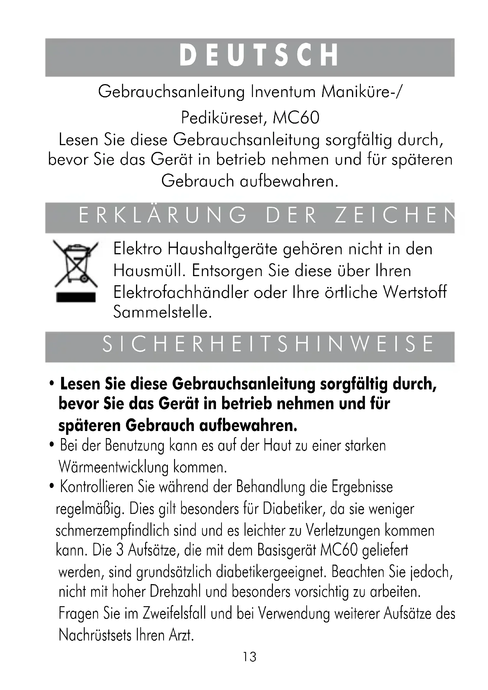 Kontrollieren Sie während der Behandlung die Ergebnisse regelmäßig. Dies gilt和其他s für Diabetiker, da sie weniger schmerzempfindlich sind und es leichter zu Verletzungen kommt kann. Die 3 Aufsätze, die mit dem Basisgerät MC60 gefelert werden, sind grundsätzlich diabetikergeeignet. Beachten Sie jedoch, nicht mit hoher Drehzahl und和其他s vorsichtig zu arbeiten. Fragen Sie im Zweifelsfall und bei Verwendung weiterer Aufsätze des Nachrüstsets ihren Arzt.