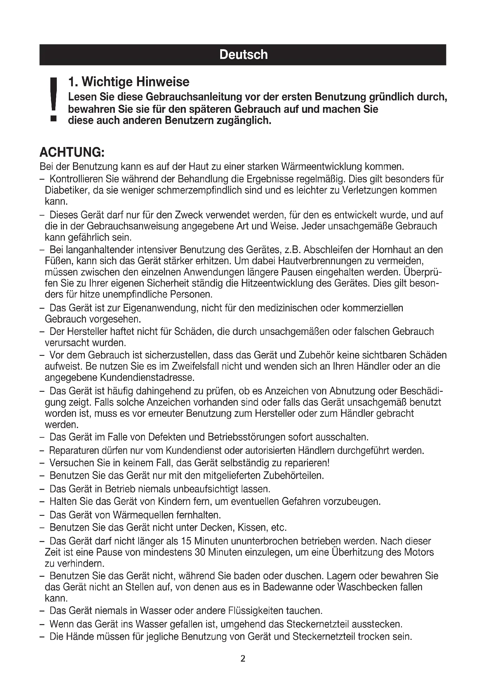 Lesen Sie diese Gebrauchsanleitung vor der ersten Benutzung gründlich durch, bewahren Sie sie für den späteren Gebrauch auf und machen Sie diese auch anderen Benutzern zugänglich. ACHTUNG: Bei der Benutzung kann es auf der Haut zu einer starken Wärmeentwicklung kommen. – Kontrollieren Sie während der Behandlung die Ergebnisse regelmäßig. Dies gilt besonders für Diabetiker, da sie weniger schmerzempfindlich sind und es leichter zu Verletzungen kommen kann. – Dieses Gerät darf nur für den Zweck verwendet werden, für den es entwickelt wurde, und auf die in der Gebrauchsanweisung angegebene Art und Weise. Jeder unsachgemäße Gebrauch kann gefährlich sein. – Bei langanhaltender intensiver Benutzung des Gerätes, z.B. Abschleifen der Hornhaut an den Füßen, kann sich das Gerät stärker erhitzen. Um dabei Hautverbrennungen zu vermeiden, müssen zwischen den einzelnen Anwendungen längere Pausen eingehalten werden. Überprü- fen Sie zu Ihrer eigenen Sicherheit ständig die Hitzeentwicklung des Gerätes. Dies gilt beson- ders für hitze unempfindliche Personen. – Das Gerät ist zur Eigenanwendung, nicht für den medizinischen oder kommerziellen Gebrauch vorgesehen. – Der Hersteller haftet nicht für Schäden, die durch unsachgemäßen oder falschen Gebrauch verursacht wurden. – Vor dem Gebrauch ist sicherzustellen, dass das Gerät und Zubehör keine sichtbaren Schäden aufweist. Be nutzen Sie es im Zweifelsfall nicht und wenden sich an Ihren Händler oder an die angegebene Kundendienstadresse. – Das Gerät ist häufig dahingehend zu prüfen, ob es Anzeichen von Abnutzung oder Beschädi- gung zeigt. Falls solche Anzeichen vorhanden sind oder falls das Gerät unsachgemäß benutzt worden ist, muss es vor erneuter Benutzung zum Hersteller oder zum Händler gebracht werden. – Das Gerät im Falle von Defekten und Betriebsstörungen sofort ausschalten. – Reparaturen dürfen nur vom Kundendienst oder autorisierten Händlern durchgeführt werden. – Versuchen Sie in keinem Fall, das Gerät selbständig zu reparieren! – Benutzen Sie das Gerät nur mit den mitgelieferten Zubehörteilen. – Das Gerät in Betrieb niemals unbeaufsichtigt lassen. – Halten Sie das Gerät von Kindern fern, um eventuellen Gefahren vorzubeugen. – Das Gerät von Wärmequellen fernhalten. – Benutzen Sie das Gerät nicht unter Decken, Kissen, etc. – Das Gerät darf nicht länger als 15 Minuten ununterbrochen betrieben werden. Nach dieser Zeit ist eine Pause von mindestens 30 Minuten einzulegen, um eine Überhitzung des Motors zu verhindern. – Benutzen Sie das Gerät nicht, während Sie baden oder duschen. Lagern oder bewahren Sie das Gerät nicht an Stellen auf, von denen aus es in Badewanne oder Waschbecken fallen kann. – Das Gerät niemals in Wasser oder andere Flüssigkeiten tauchen. – Wenn das Gerät ins Wasser gefallen ist, umgehend das Steckernetzteil ausstecken. – Die Hände müssen für jegliche Benutzung von Gerät und Steckernetzteil trocken sein. Deutsch